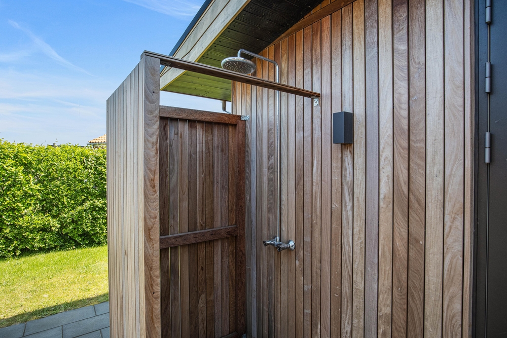 Wer eine kleine Abkühlung wünscht ? sei es zwischen den Saunagängen oder an einem heißen Sommertag, nutzt die tolle Außendusche.