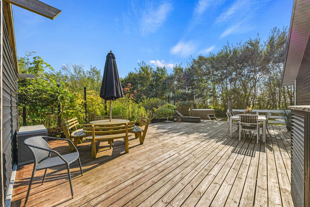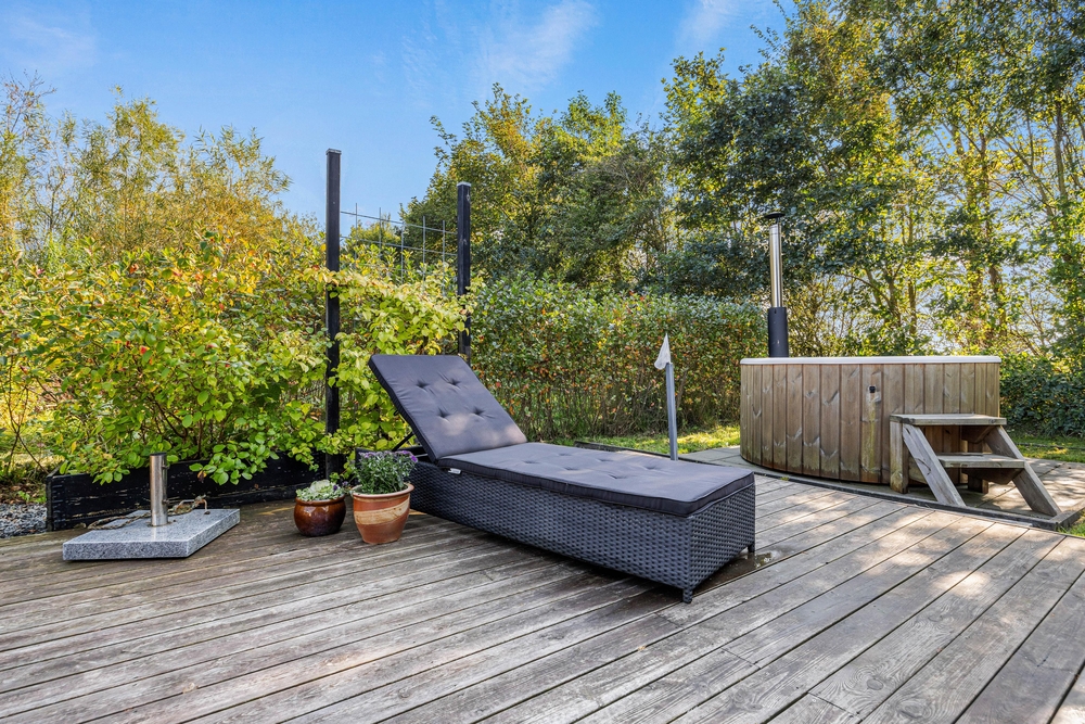 Die großzügige, teils abgeschirmte Terrasse eignet sich perfekt für entspannte Abende oder gemeinsame Mahlzeiten im Freien. Der Gasrill steht bereit, sodass ihr leckere Barbecue-Abende mit Familie und Freunden verbringen könnt. Eine Badetonne sorgt für Entspannung an der frischen Luft.