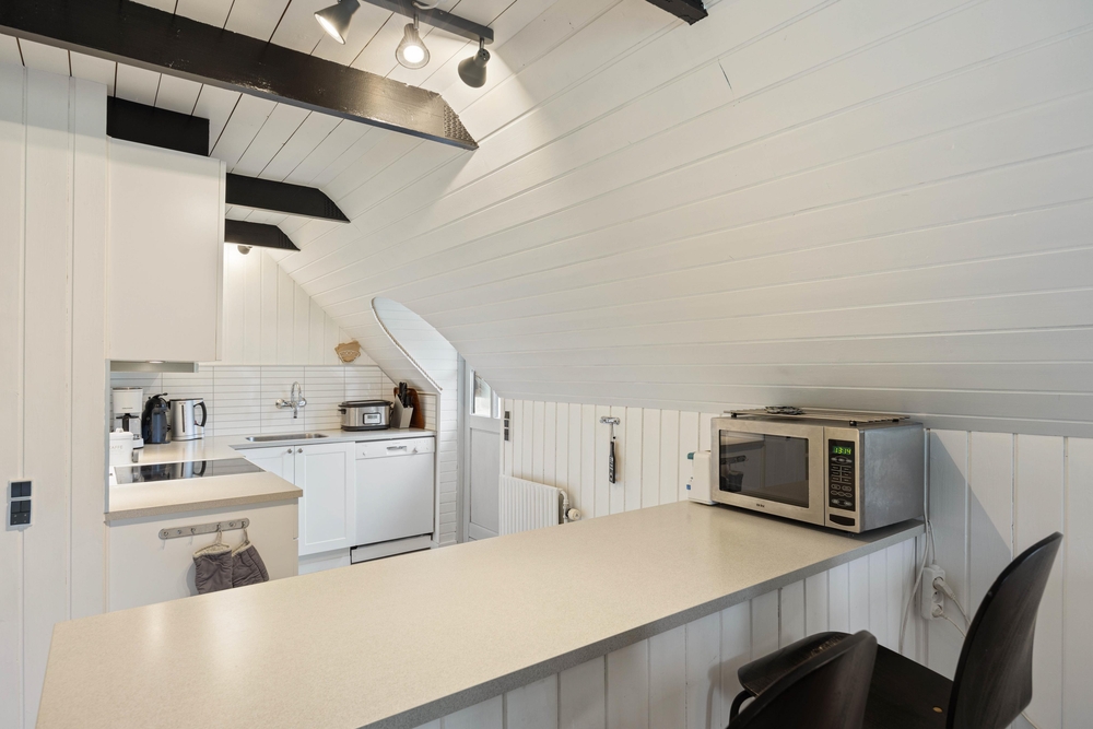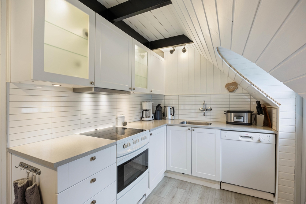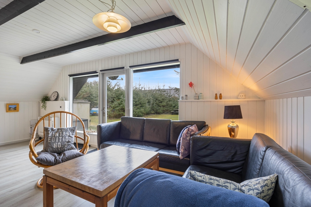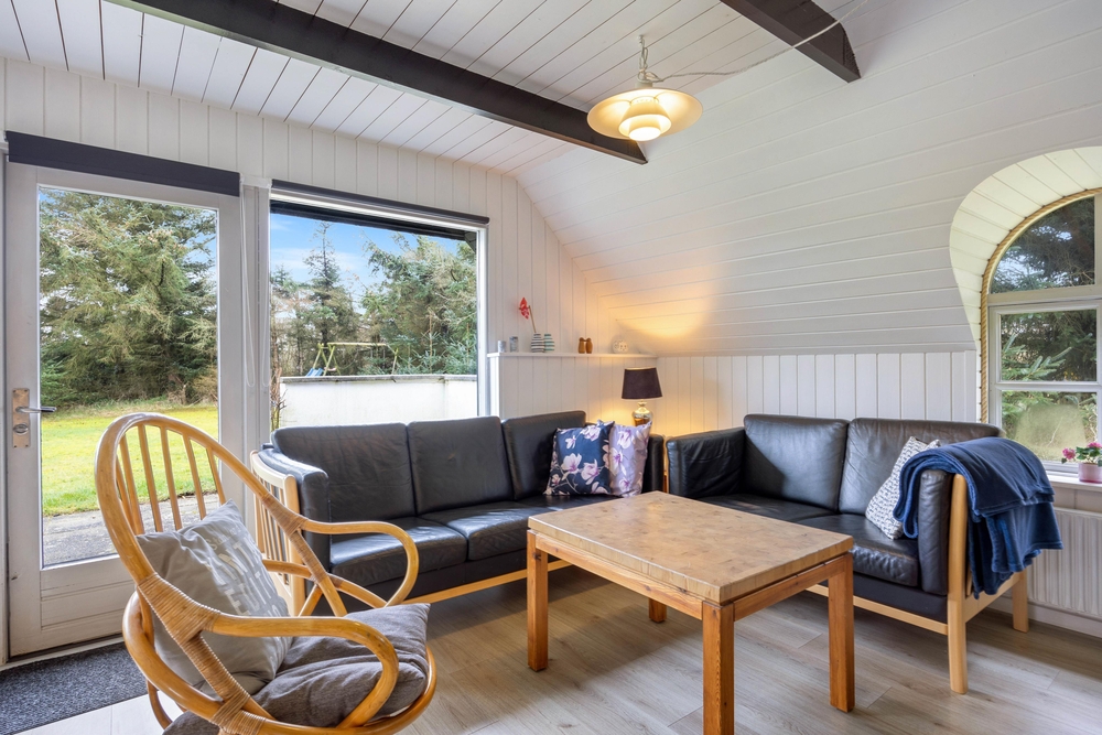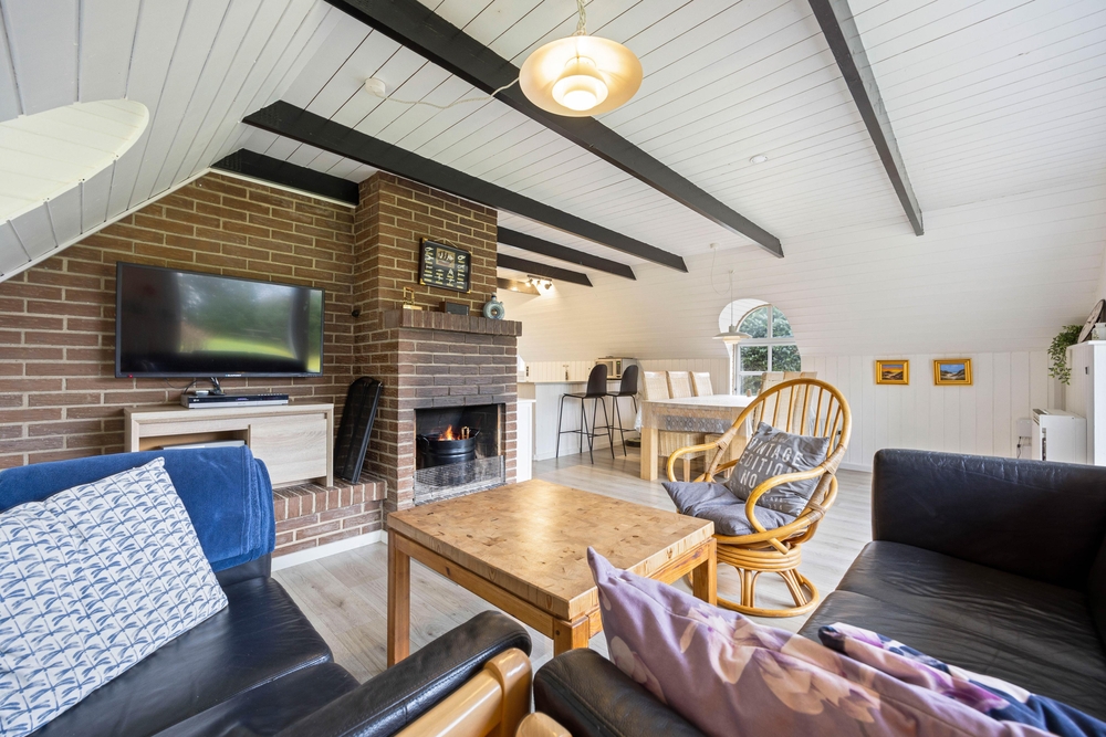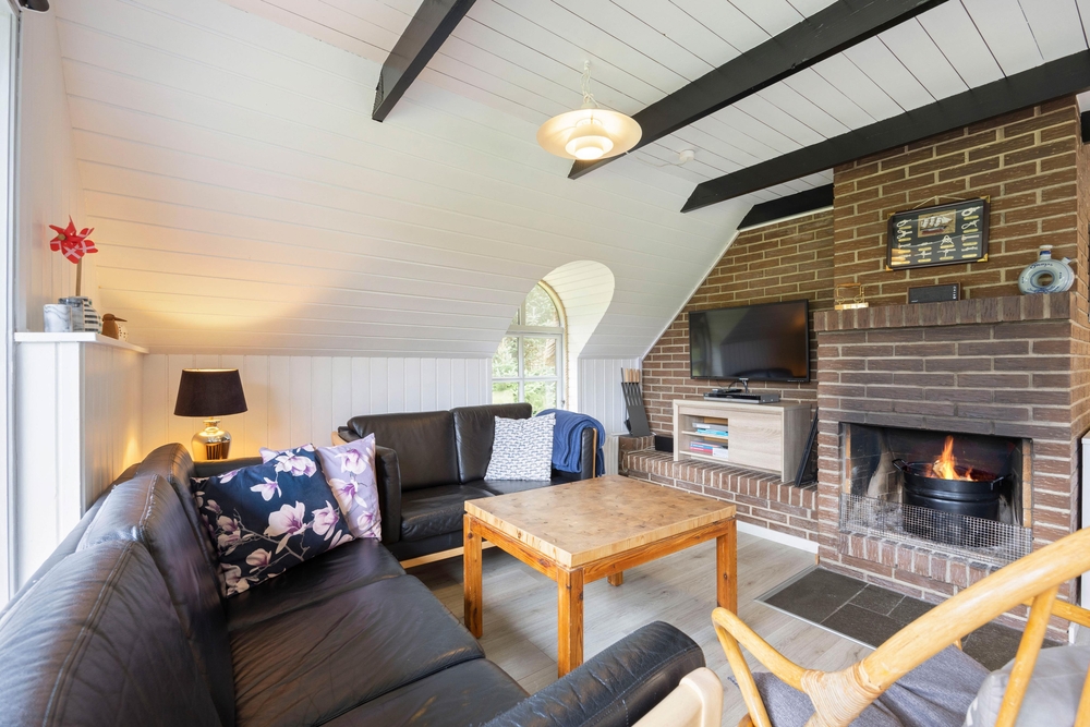 Die Inneneinrichtung mit viel Holz und sorgsam dosierten farbigen Akzenten bildet einen total gemütlichen Rahmen für die schönsten Tage des Jahres. Natürlich fehlt auch ein offener Kamin nicht, so dass man das Haus hier ganzjährig wohlig temperieren kann.