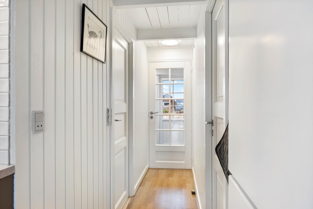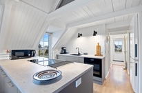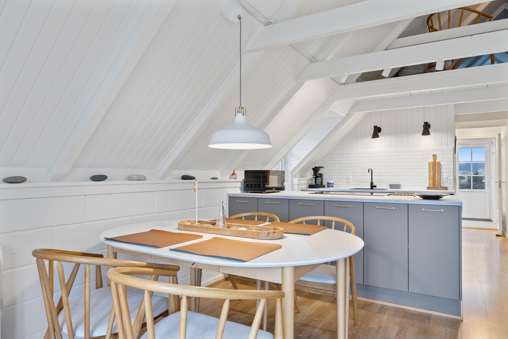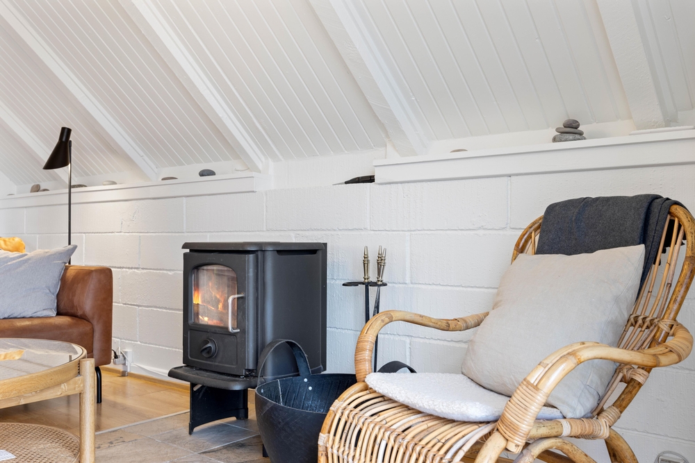 Durch die hellen Wände und Holzdecken, kombiniert mit den farbenfrohen Akzenten verströmt dieses gemütliche kleine Ferienhaus seinen ganz eigenen Charme. Im mit der Küche kombinierten Wohnraum wird sich das Ferienleben überwiegend abspielen. Hier kann gemeinsam gekocht, gegessen und gespielt werden. Aber auch ein gemütlicher Abend vor dem knisterden Kaminofen hat seinen Reiz.