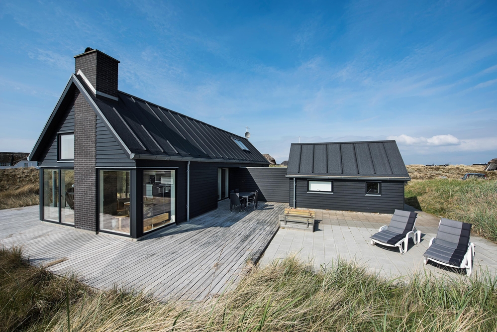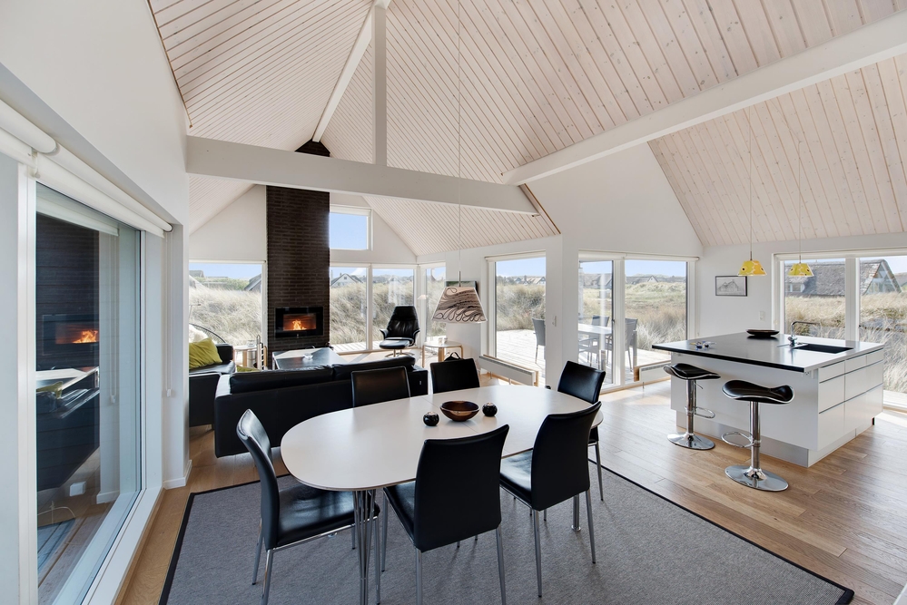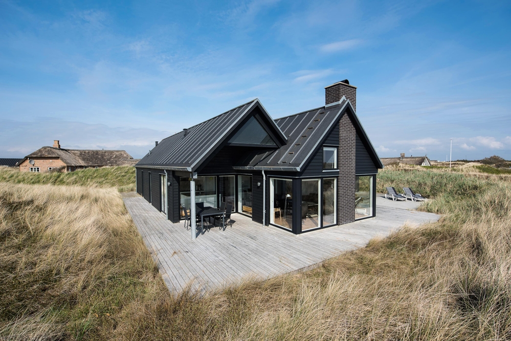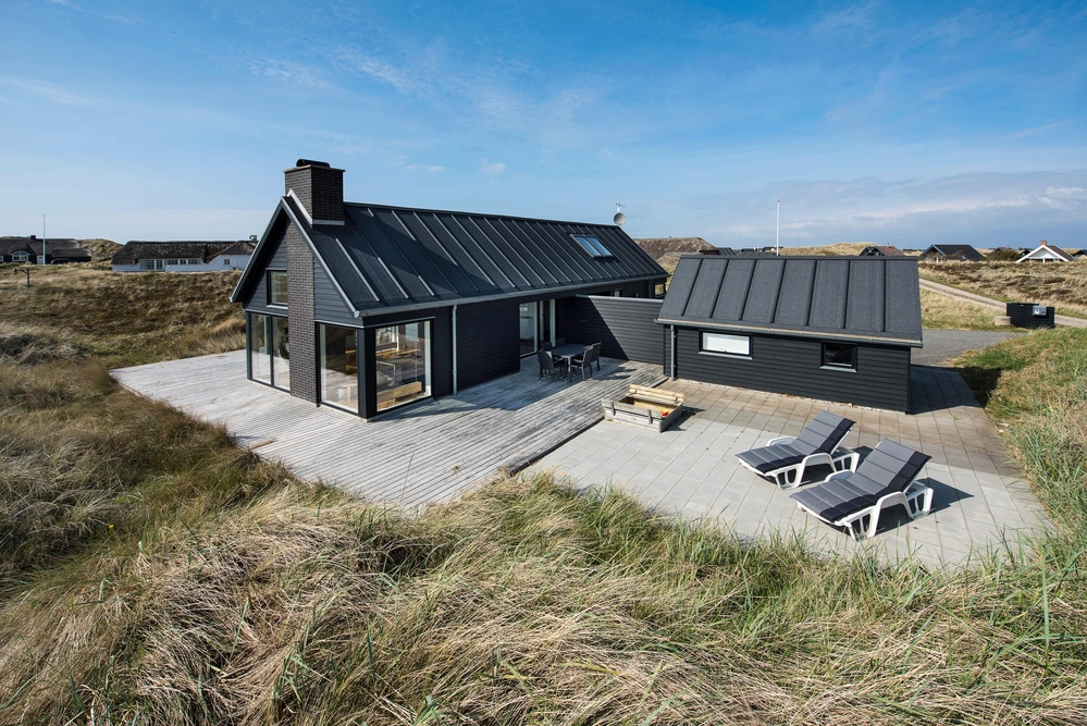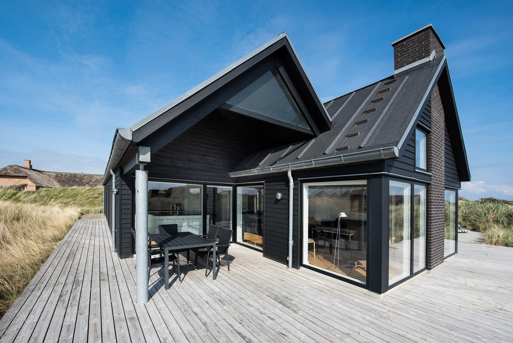 Dieses Ferienhaus liegt auf einem schönen Naturgrundstück und wurde aus schwarzem Holz gebaut. Gleich wenn ihr das Haus betretet, werdet ihr euch mit Sicherheit wohl fühlen und der Urlaub kann sofort starten. Im Wohnbereich gibt es hohe Decken und große Fenster, die für viel Licht und eine schöne Aussicht sorgen.