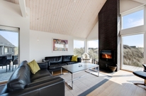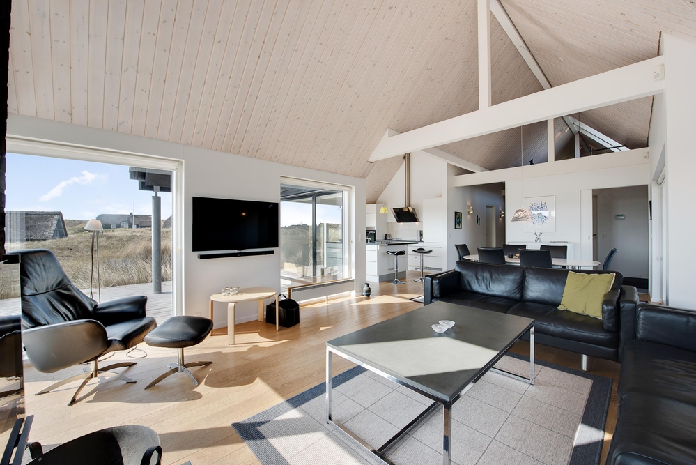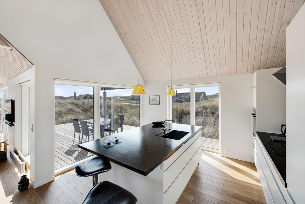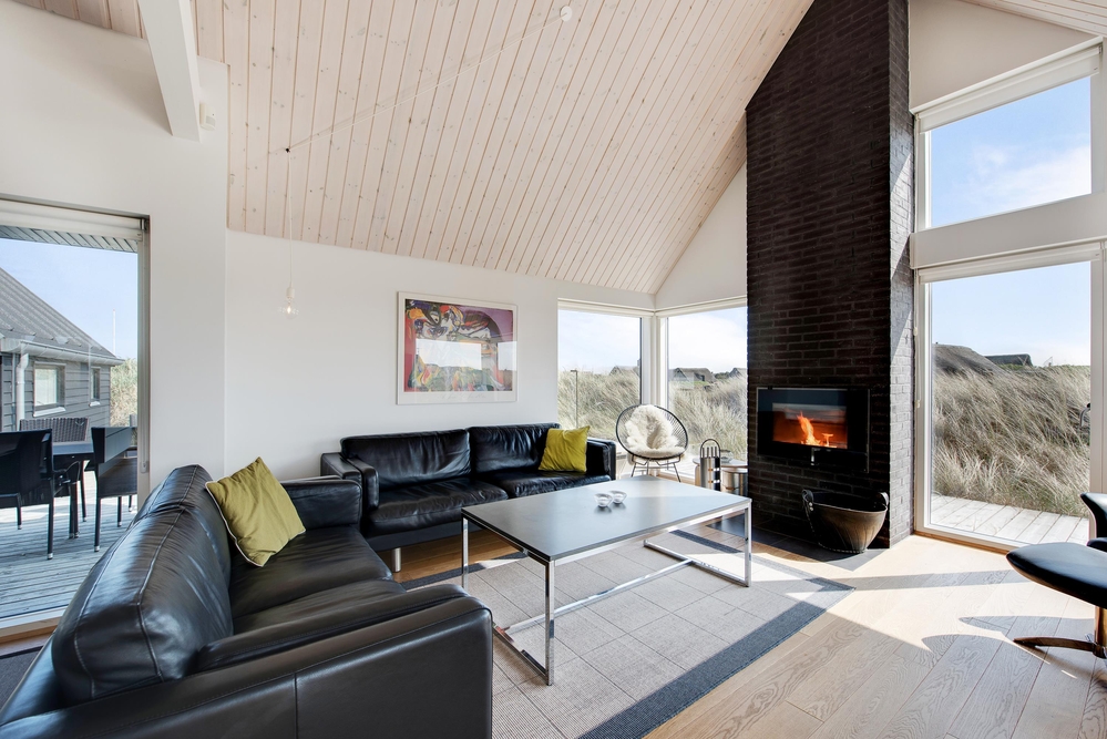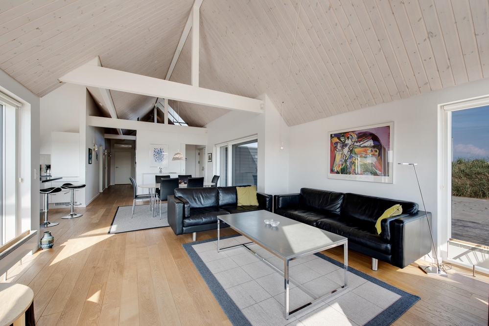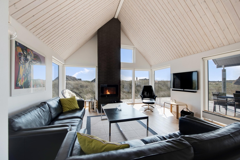 Dieses Ferienhaus liegt auf einem schönen Naturgrundstück und wurde aus schwarzem Holz gebaut. Gleich wenn ihr das Haus betretet, werdet ihr euch mit Sicherheit wohl fühlen und der Urlaub kann sofort starten. Im Wohnbereich gibt es hohe Decken und große Fenster, die für viel Licht und eine schöne Aussicht sorgen.