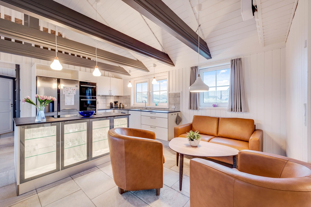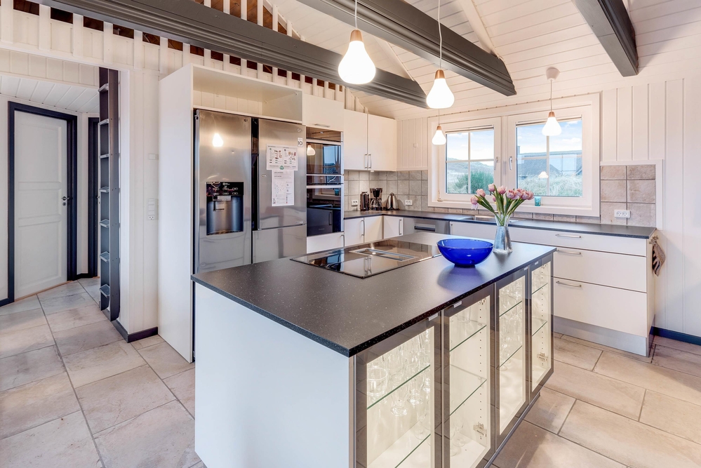 Die in den großen Wohn- und Essbereich integrierte Küche verfügt über eine Mikrowelle sowie natürlich auch einen Geschirrspüler. Statt mühsam nach dem Kochen noch alles per Hand zu spülen, lasst ihr euch hier unter die Arme greifen und habt stattdessen mehr Zeit für zum Beispiel einen Strandspaziergang oder ein Nickerchen auf dem Liegestuhl auf der Terrasse.