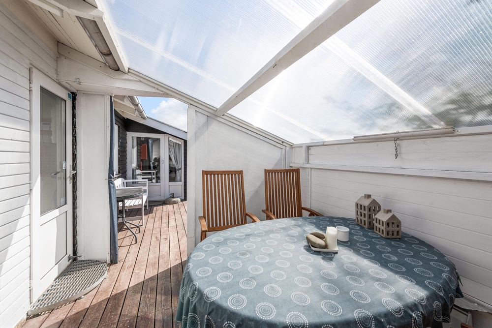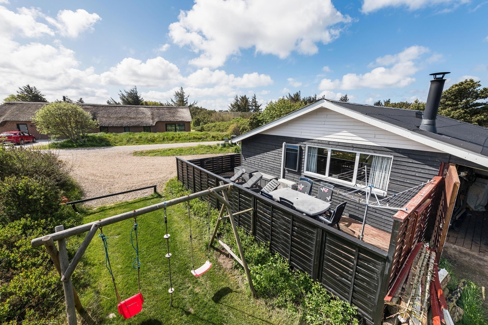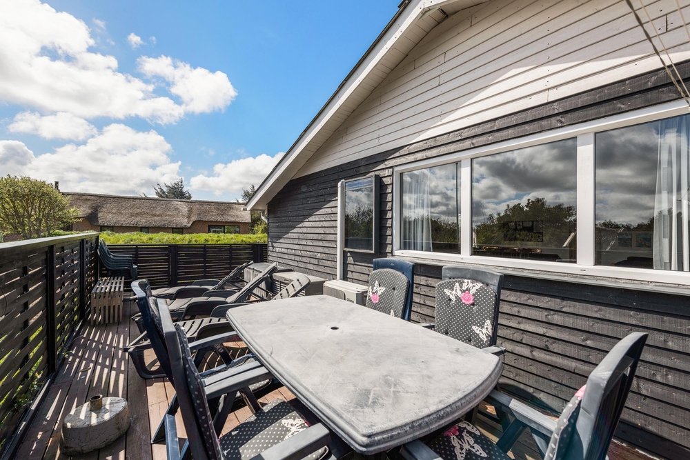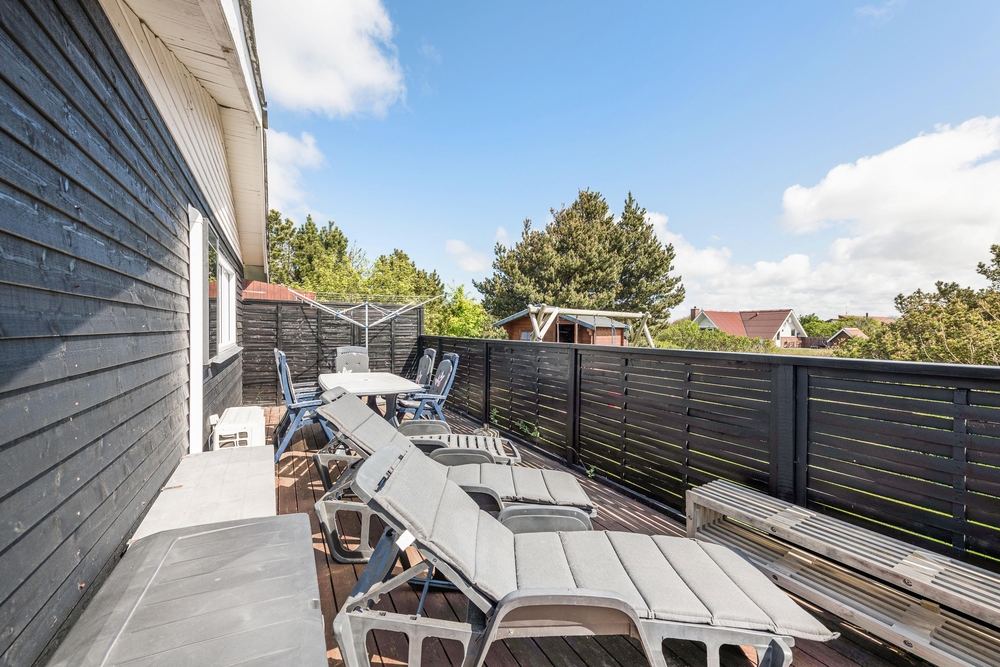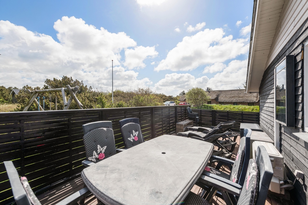 Die geschlossene und teilweise überdachte Terrasse ist vor allem an warmen und sonnigen Tagen ein schöner Aufenthaltsort für die ganze Familie. Euer Hund kann sich auf der Terrasse frei bewegen und die Kinder können nebenan auf der Wiese und der Schaukel spielen. Auf dem offenen Teil der Terrasse könnt ihr euch bei einem Sonnenbad entspannen und wenn das Wetter mal nicht ganz mitspielt, könnt ihr unter dem überdachten Teil trotzdem den Gasgrill anschmeißen. Von hier aus sind es 800 Meter bis zum herrlichen Nordseestrand, sodass ihr einen Sparziergang dorthin machen und anschließend die Füße ins Wasser halten könnt.