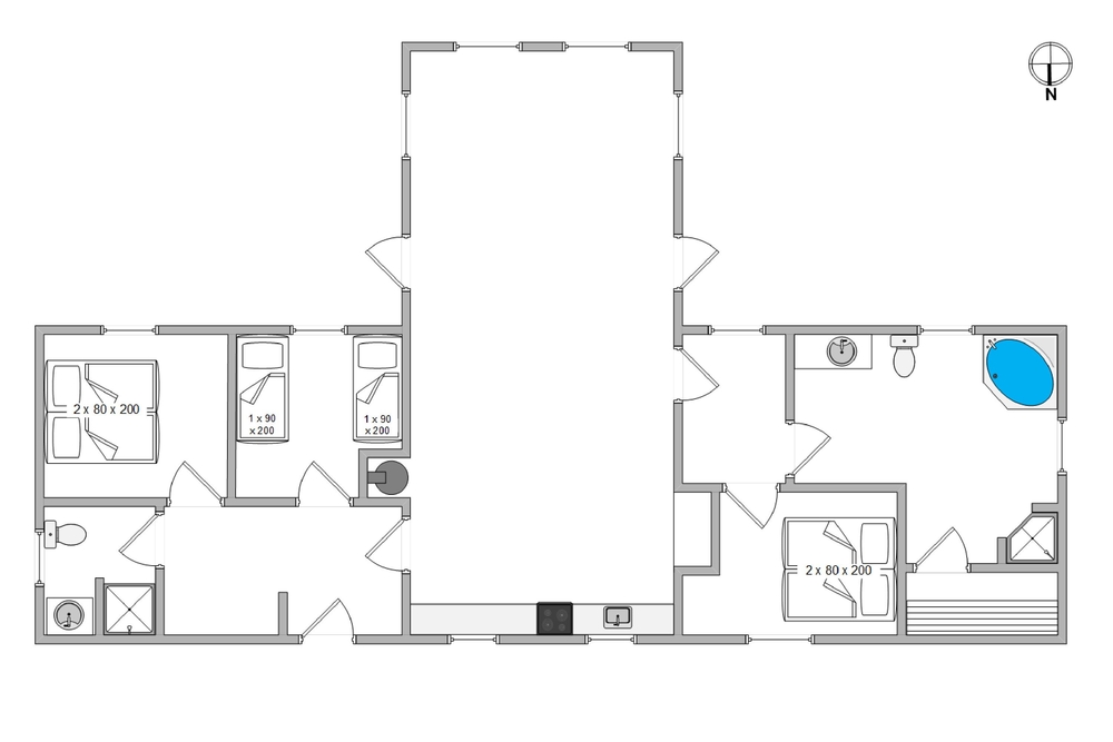 Im Herz des Hauses befindet sich das Wohnzimmer, der Essbereich und die Küche ? ein schöner, großer Raum mit firsthoher Decke und schönem Lichteinfall von den Fenstern. Mit Kaminofen, der den großen Raum aufwärmen kann, aber Ihr könnt auch sorglos die Heizung einschalten, da das Haus über eine energiesparende Wärmepumpe verfügt.
