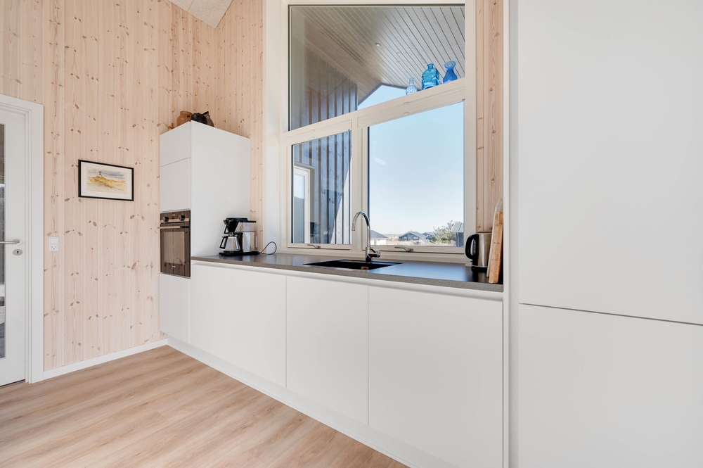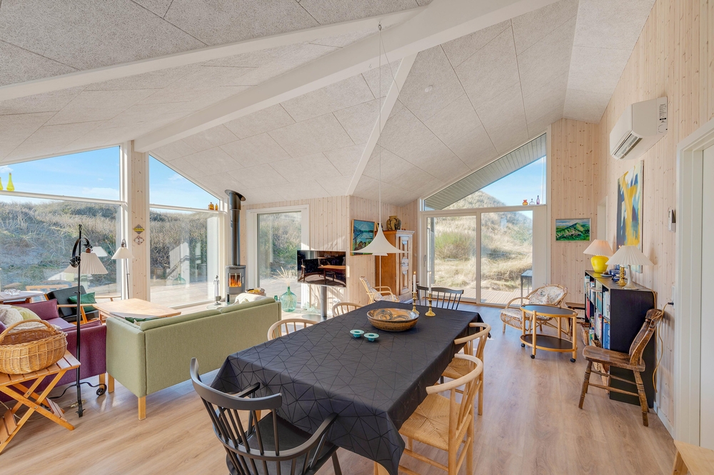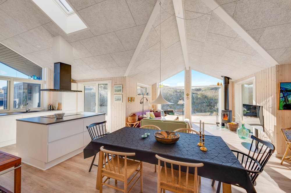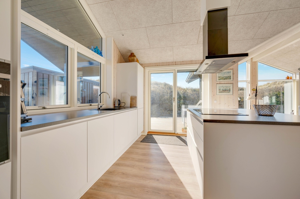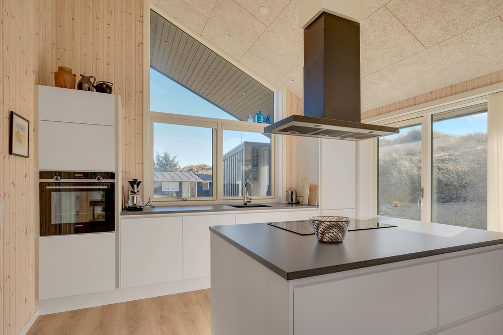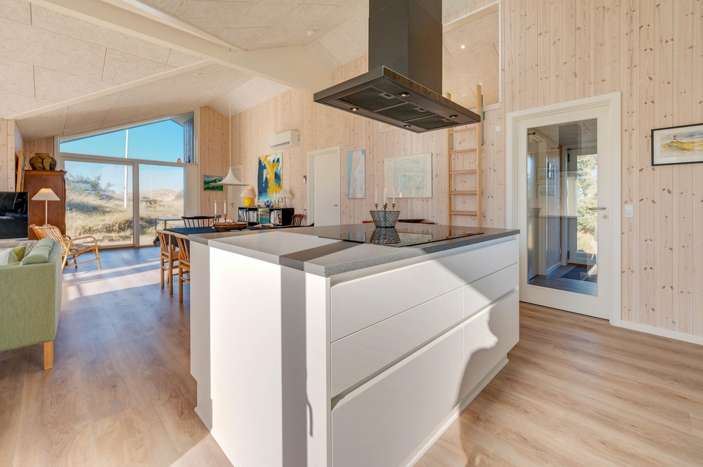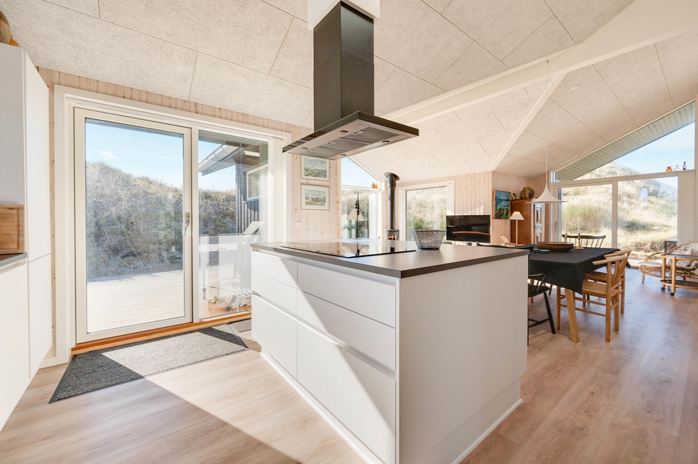 Egal von wo aus ihr hier aus den großen Fenstern schaut, von allen Seiten habt ihr einen wunderbaren Blick auf euer Naturgrundstück mit der wunderschönen Dünen- und Naturlandschaft der Westküste Dänemarks. Sei es nun mit einem guten Buch oder einfach einem entspannten Fernsehabend, die Sofaecke mit großer Fensterfront lädt zu vielen gemütlichen Stunden am Abend ein. Für wohlige Wärme könnt ihr den Kamin anheizen und dem Knistern des Feuers lauschen, ebenso gibt es die Möglichkeit das Haus über eine kostensparende Wärmepumpe zu beheizen. Die moderne Küche ist gut und mit allem nützlichen ausgestattet und lädt zum gemeinsamen Kochen an der Kochinseln ein.