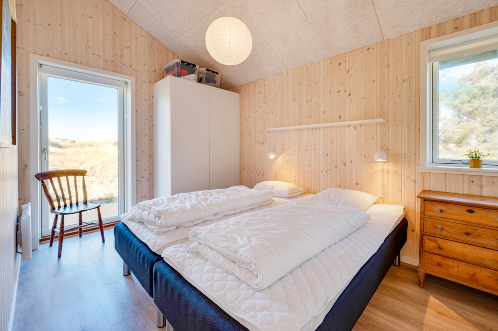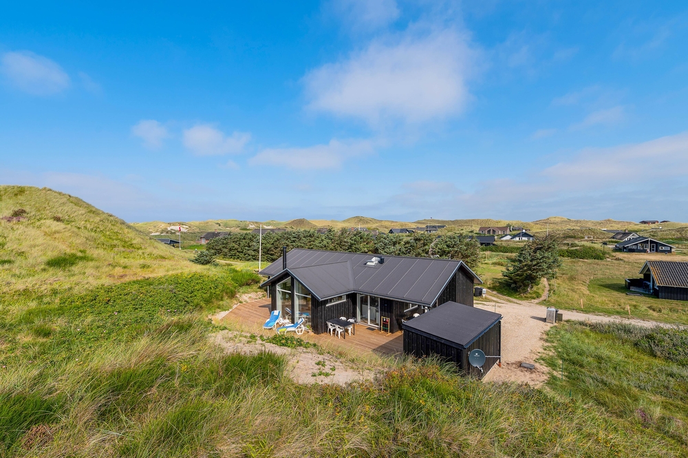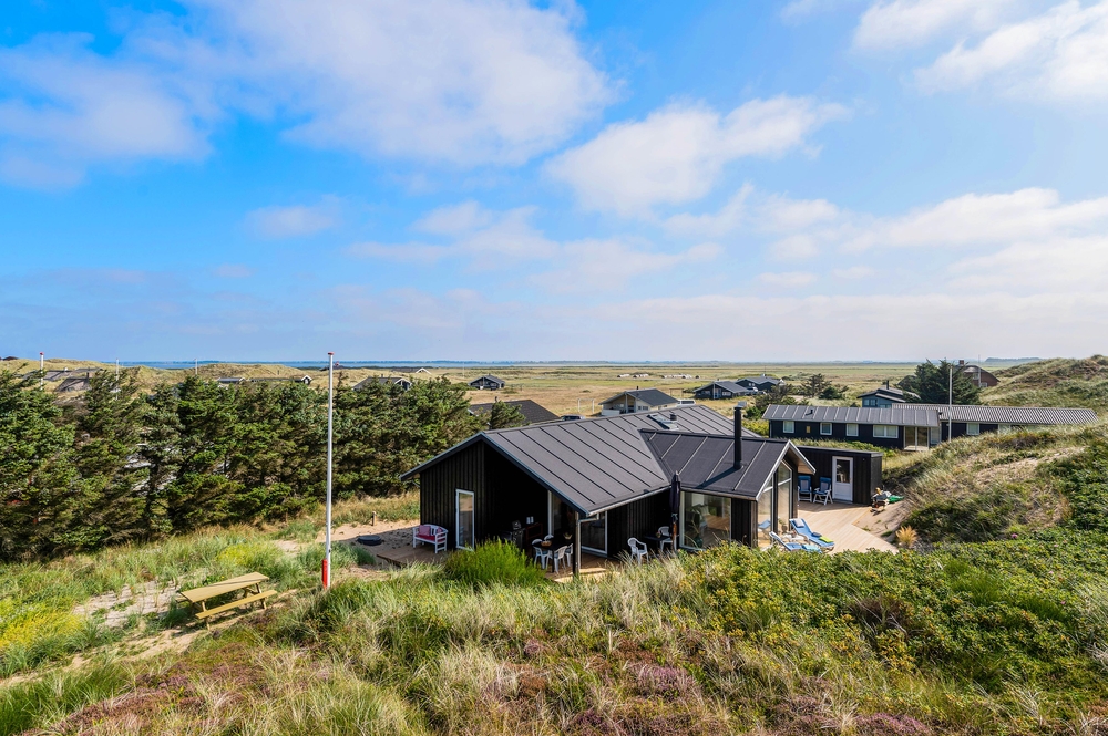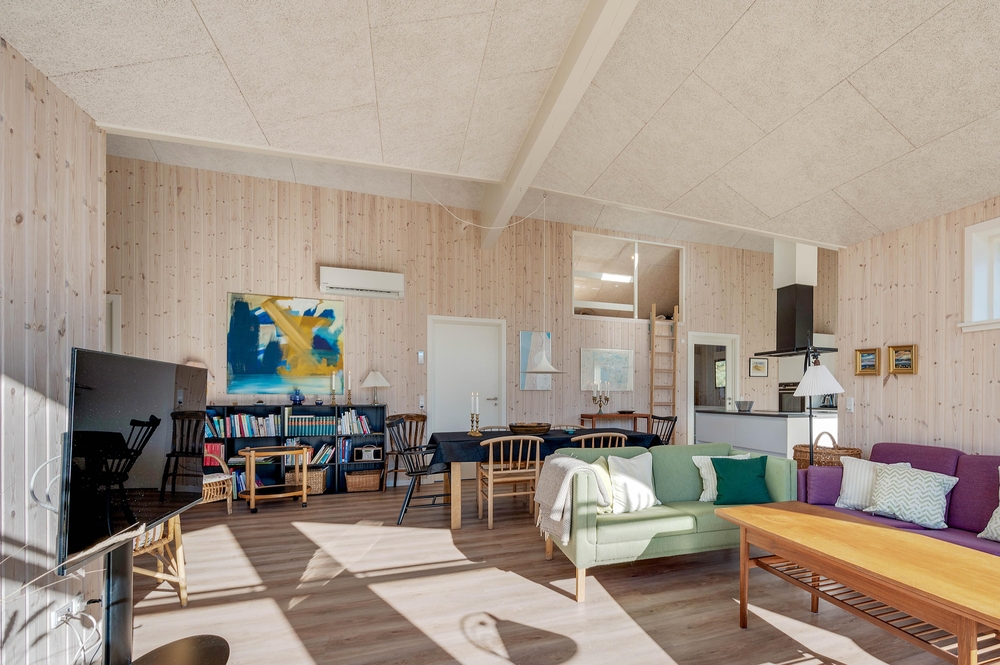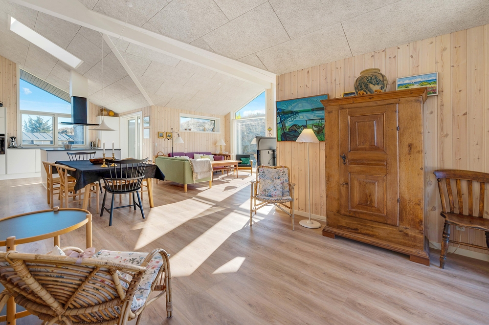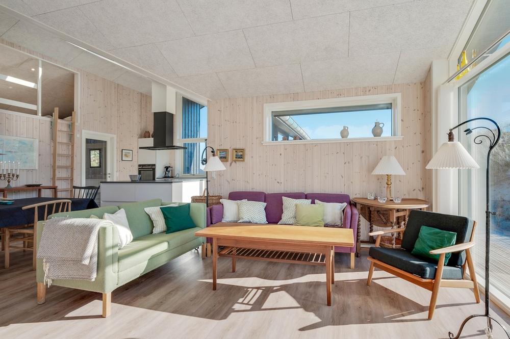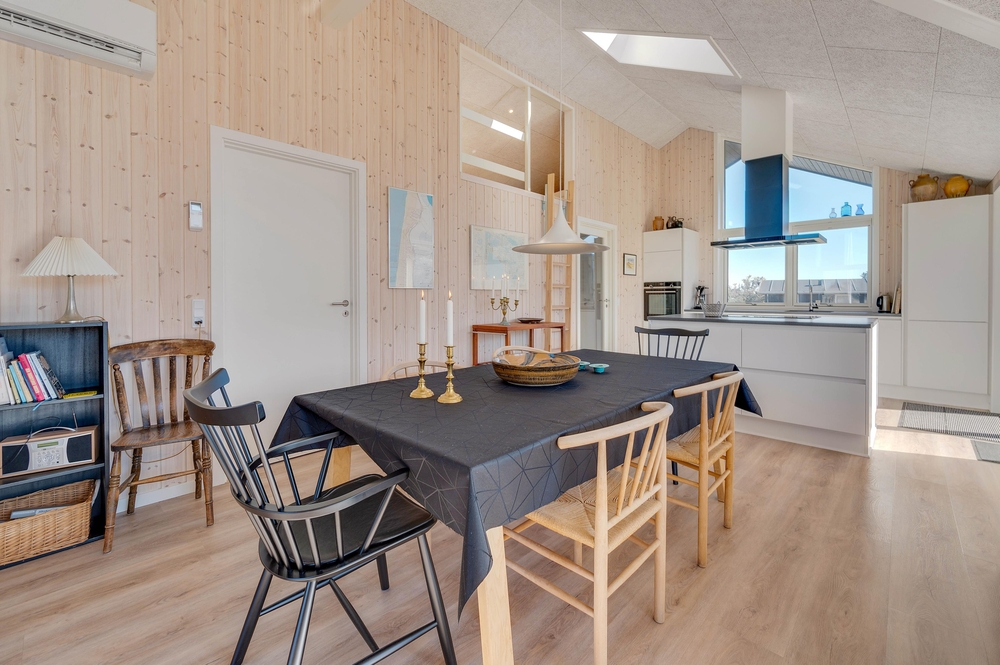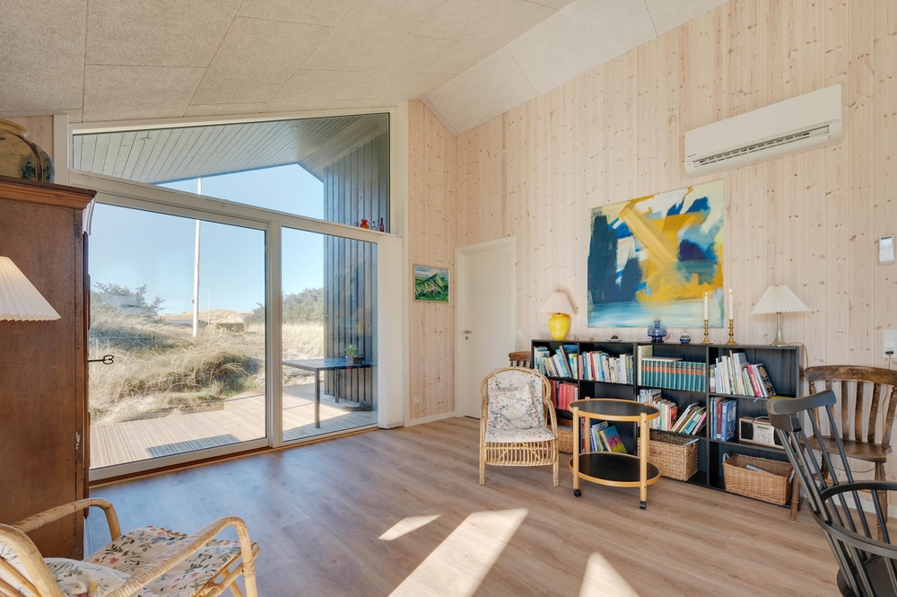 Egal von wo aus ihr hier aus den großen Fenstern schaut, von allen Seiten habt ihr einen wunderbaren Blick auf euer Naturgrundstück mit der wunderschönen Dünen- und Naturlandschaft der Westküste Dänemarks. Sei es nun mit einem guten Buch oder einfach einem entspannten Fernsehabend, die Sofaecke mit großer Fensterfront lädt zu vielen gemütlichen Stunden am Abend ein. Für wohlige Wärme könnt ihr den Kamin anheizen und dem Knistern des Feuers lauschen, ebenso gibt es die Möglichkeit das Haus über eine kostensparende Wärmepumpe zu beheizen. Die moderne Küche ist gut und mit allem nützlichen ausgestattet und lädt zum gemeinsamen Kochen an der Kochinseln ein.