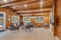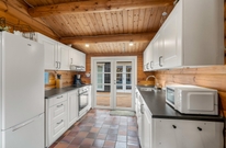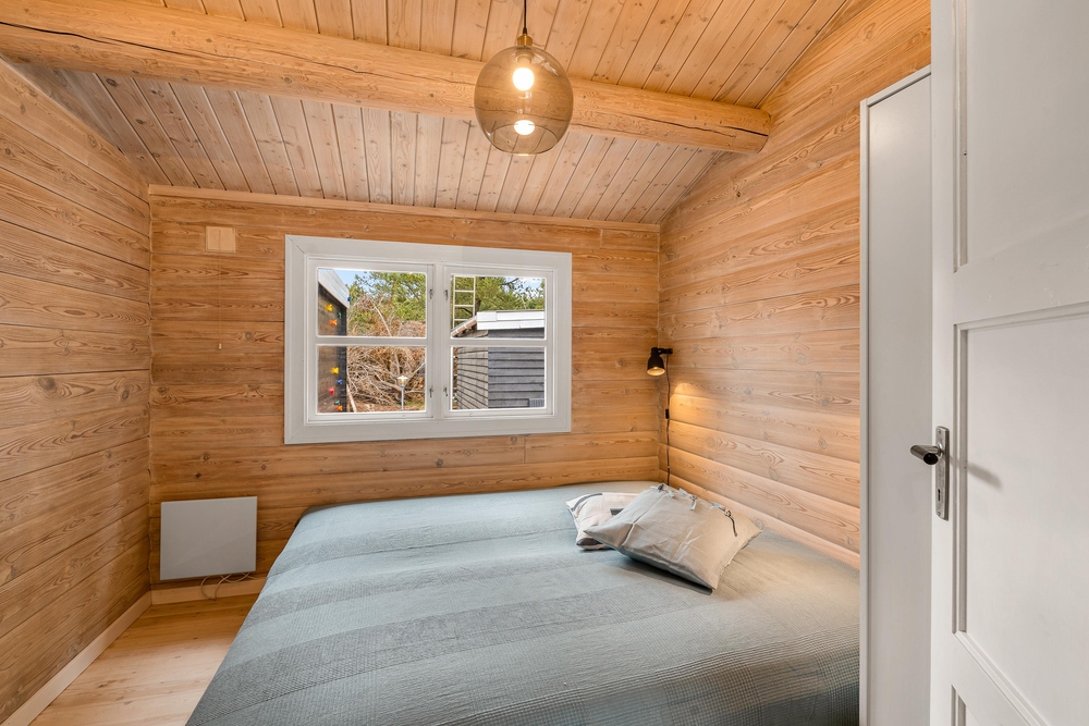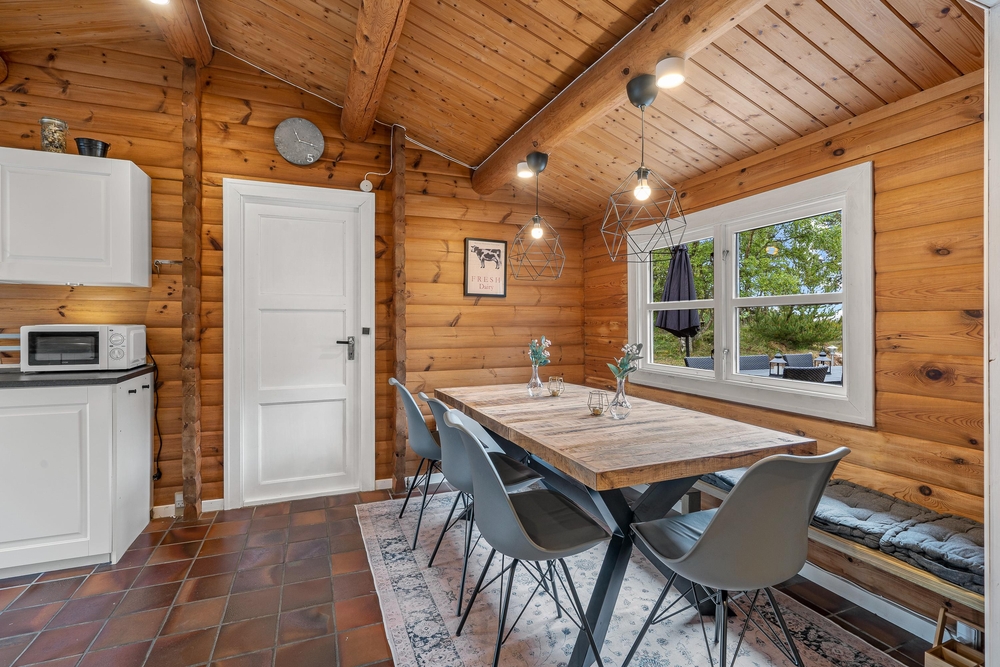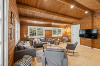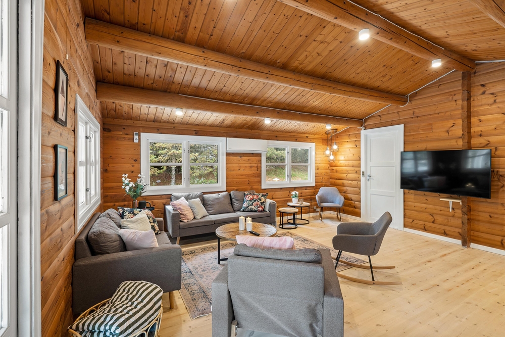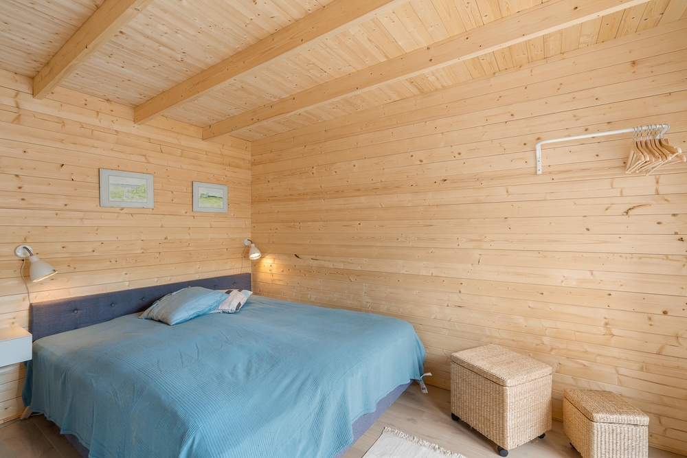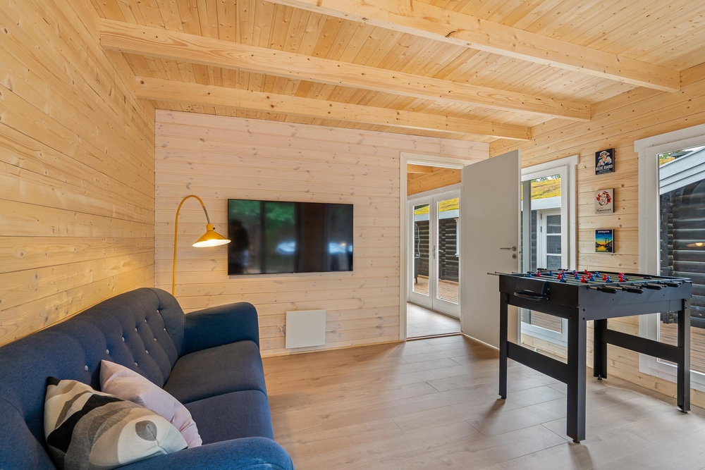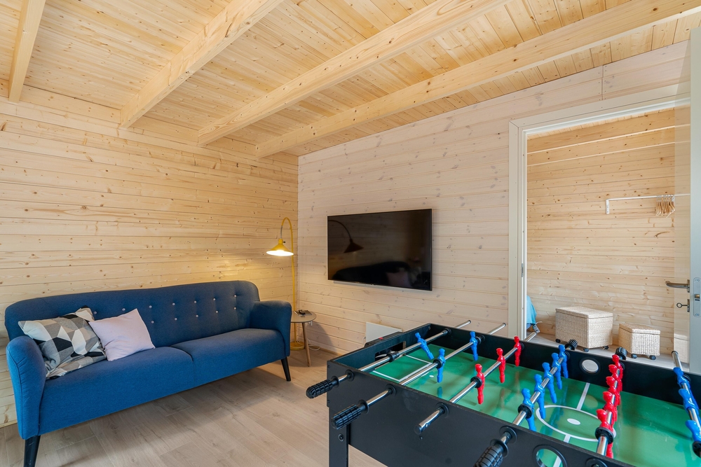 Im Inneren des Ferienhauses herrscht eine ruhige und schlichte Atmosphäre mit sichtbaren Deckenbalken und Holzelementen, die dem Haus Charakter verleihen. Die Sofaecke ist um den Kamin herum angeordnet, der an kühlen Abenden sanfte Wärme spendet und Gemütlichkeit schafft. Das Haus verfügt über große Fenster, die einen Blick auf die umliegende Natur bieten. Es gibt drei Schlafzimmer ? eines mit zwei Einzelbetten und zwei mit Doppelbetten ? sowie ein Badezimmer, die zusammen für erholsamen Schlaf nach den Erlebnissen des Tages sorgen. Der Tischtennistisch im Wohnbereich lädt zu lustigen und entspannten Momenten für Kinder und Erwachsene ein.