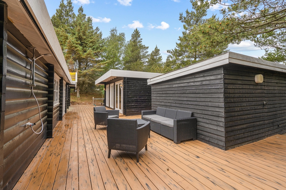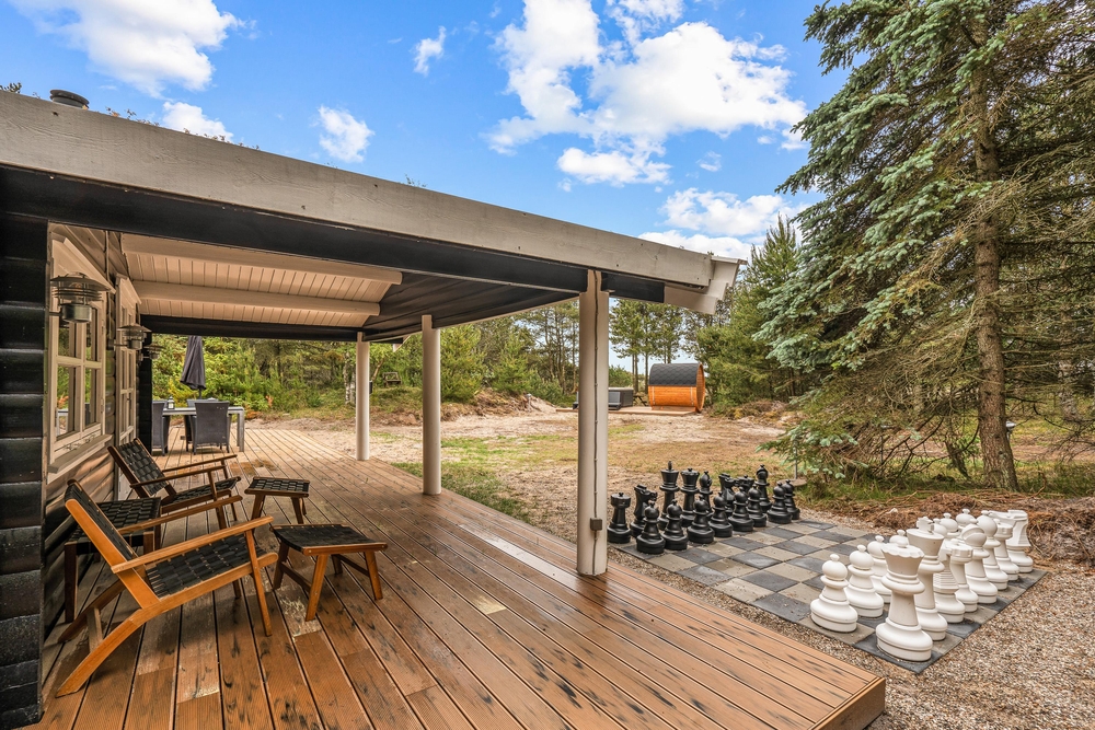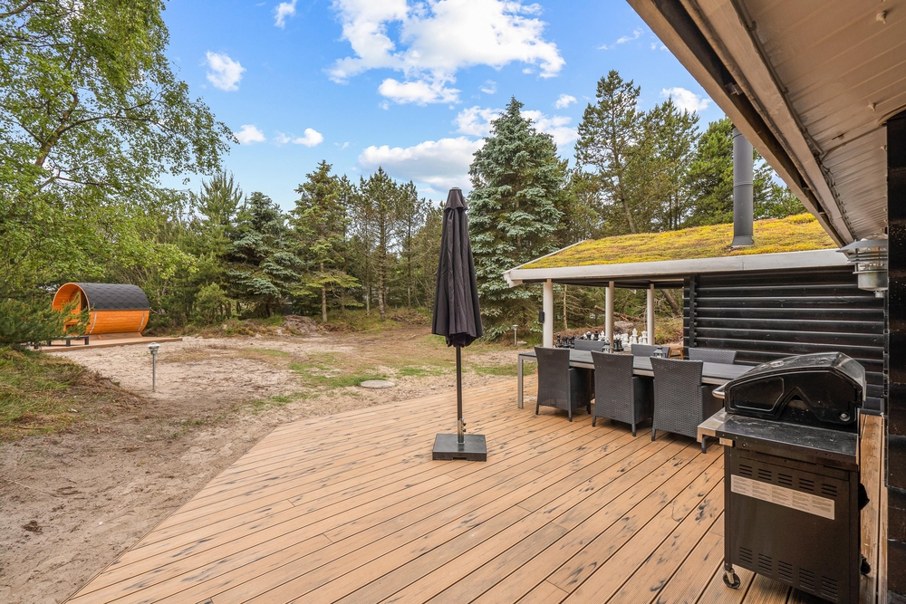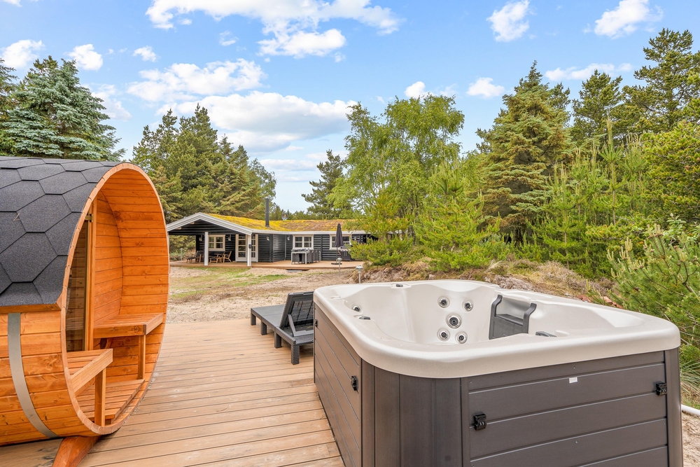 Die Außenbereiche des Ferienhauses tragen zur entspannten Atmosphäre bei. Der Außen-Whirlpool bietet warme Blasen unter freiem Himmel, sodass Sie den Blick in den Himmel ? abends vielleicht auf den Sternenhimmel ? genießen und den Körper nach einem Tag am Strand oder in der Natur entspannen können. Die Außensauna bietet ein warmes und ruhiges Erlebnis, bei dem Sie sich aufwärmen und eine kleine Auszeit genießen können. Die Außendusche ist praktisch, um Sand nach dem Strandbesuch abzuspülen und kann von 1. April bis 31. Oktober genutzt werden.