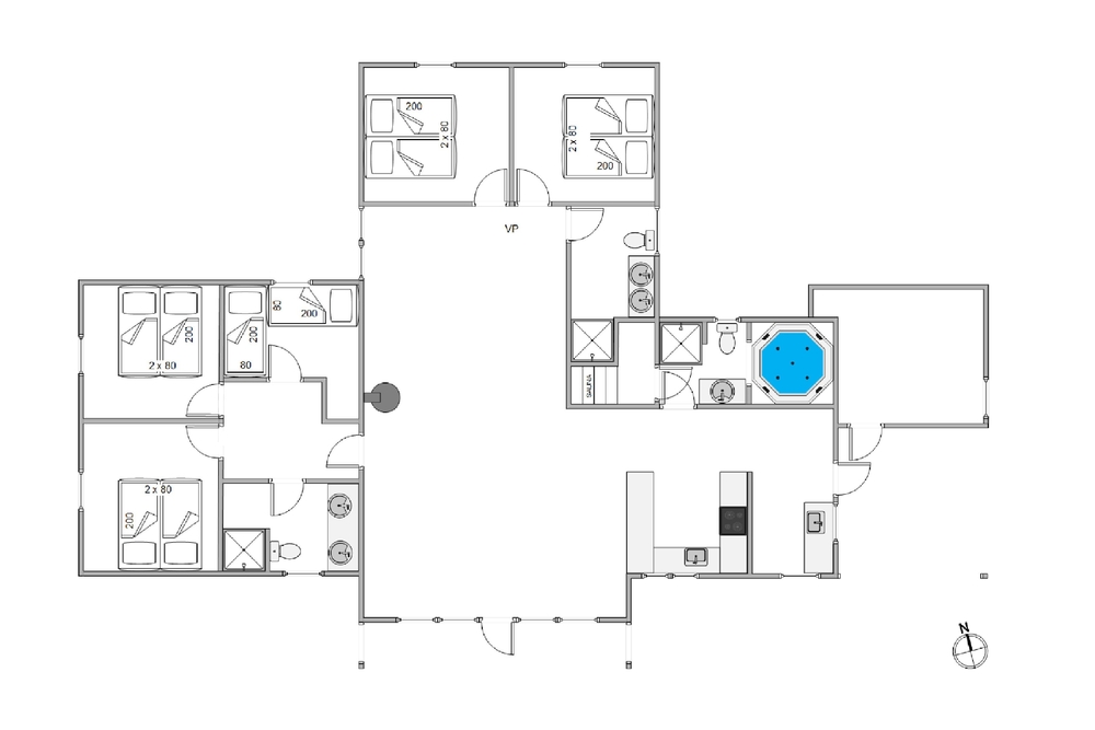 Die Schlafplätze sind auf 4 Schlafzimmer mit jeweils 2 Doppelbetten, und 1 Schlafzimmer mit 2 Einzelbetten aufgeteilt. In den drei Badezimmern, bekommt morgens keiner, kalte Füße, und jeder hat die nötige Privatsphäre die er braucht. Wellness Liebhaber kommen in der Sauna, oder dem sprudelnden Whirlpool voll auf Ihre Kosten.