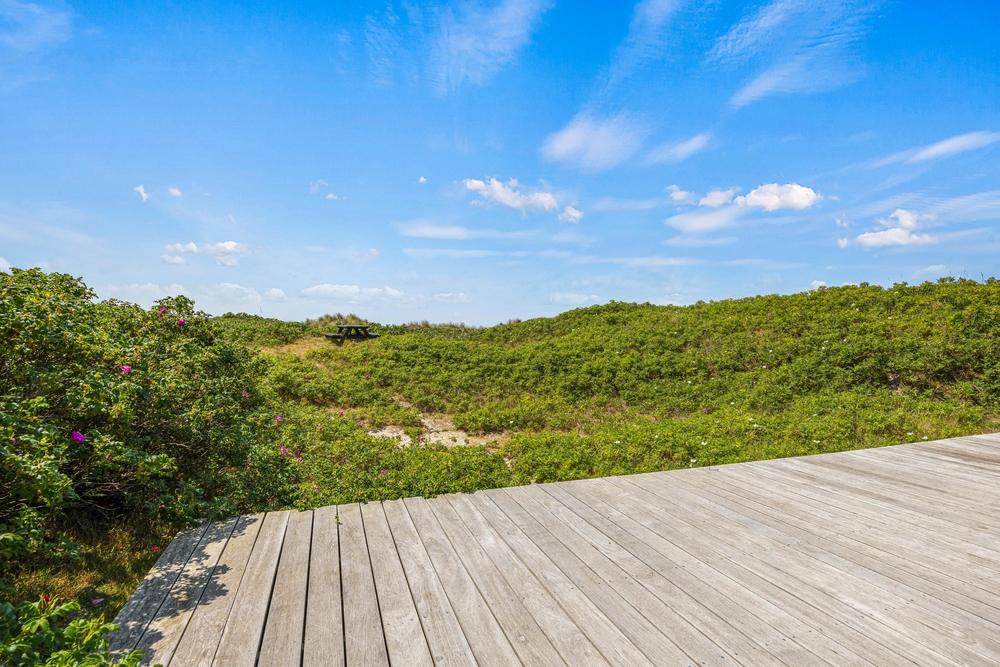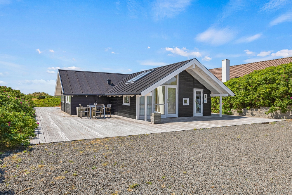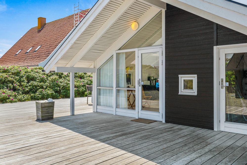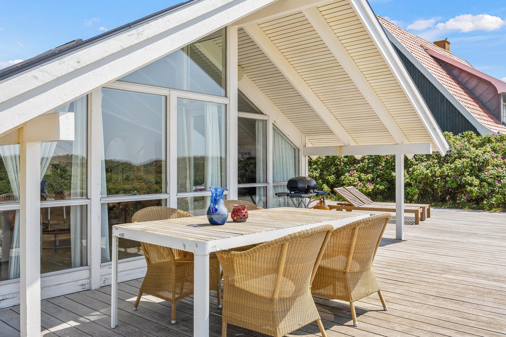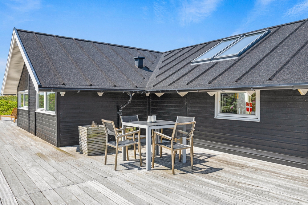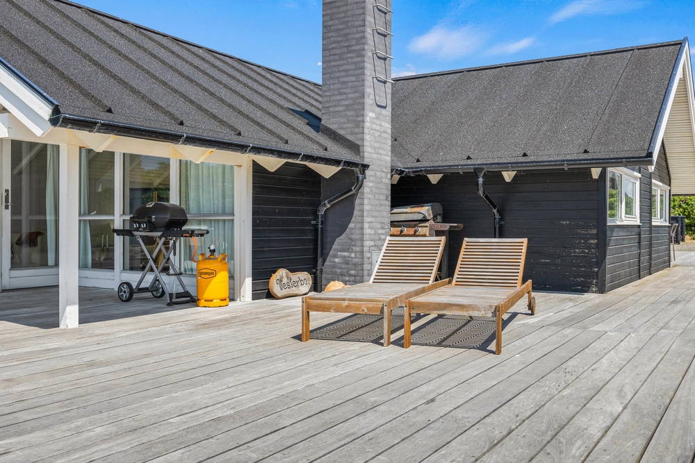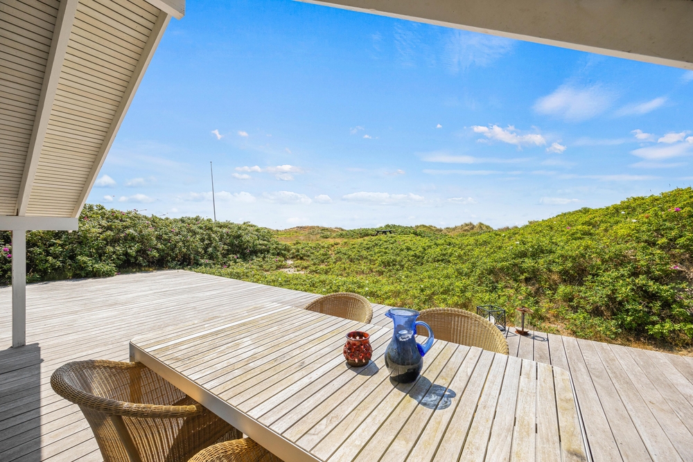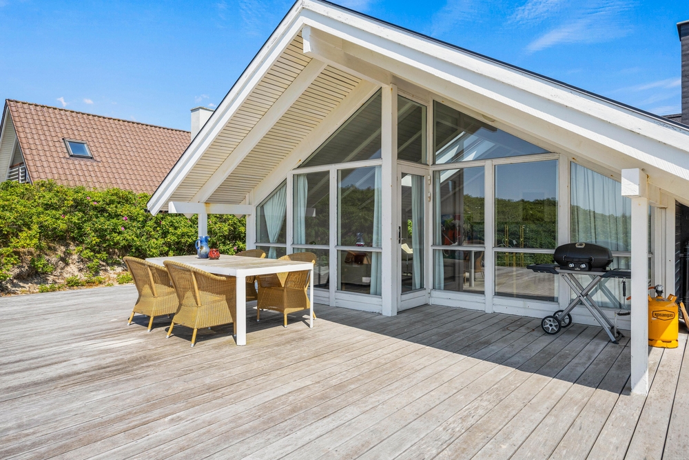 Rundum das Ferienhaus wurde eine traumhafte Holzterrasse angelegt, auf der ihr Barfuß laufen könnt, während auf dem Gasgrill das Steak brutzelt, oder ihr es euch auf den Liegestühlen bequem macht. Ein paar Meter weiter, etwas höher gelegen, stehen Holzmöbel, von denen ihr einen einmaligen Ausblick auf die Nordsee und den Sonnenuntergang habt.