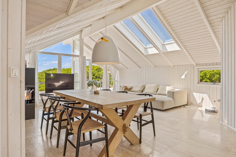 Im offenen Wohnbereich mit einem langen Esstisch, kommt ihr für die gemeinsamen Ferienstunden zusammen. Mit einem knisternden Feuer im Kaminofen, kommt das dänische Hygge Gefühl auf; und der Filme, oder Spieleabend wird erst so richtig gemütlich.