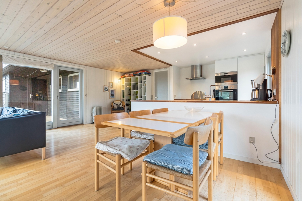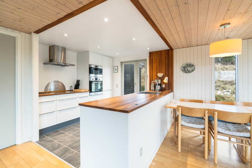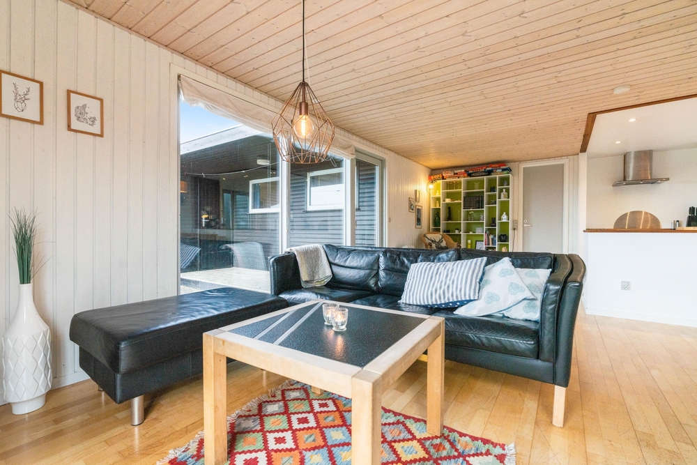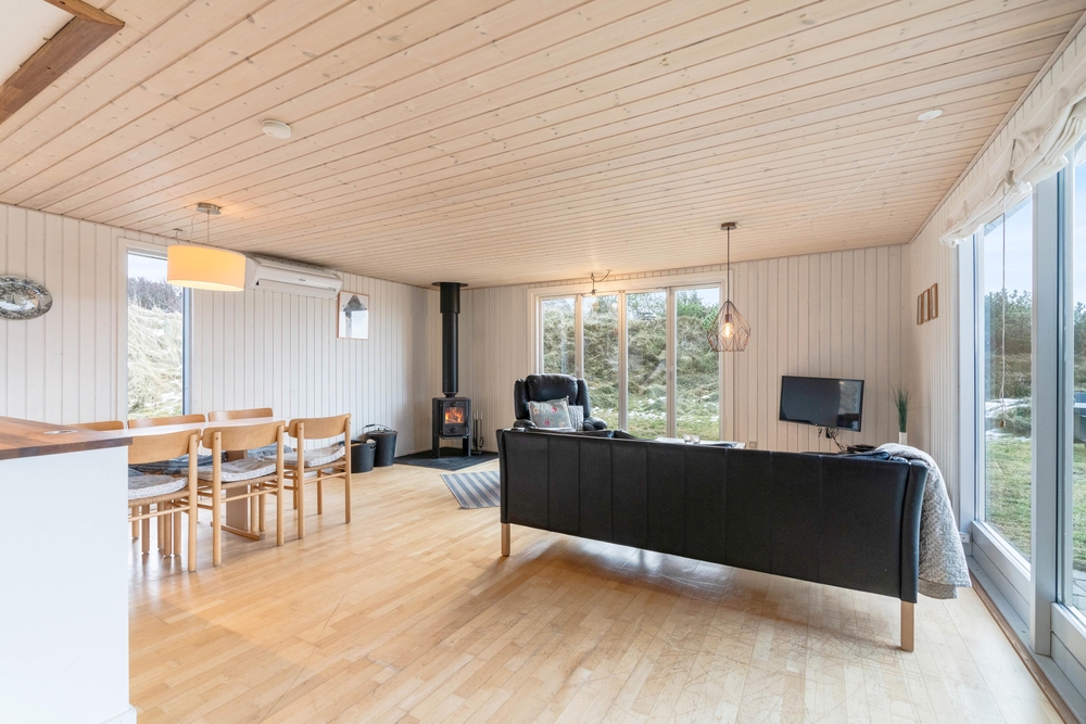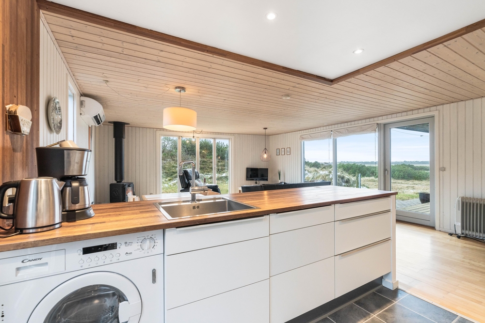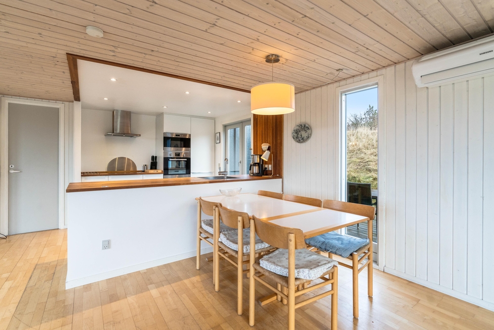 Im Wohn ? und Essbereich gibt es große Fenster, die viel Licht hereinlassen. Es gibt einen Esstisch, an dem ihr euer gemeinsames Abendessen genießen, und danach den Tag auf dem Sofa ausklingen lassen könnt. An den Fernseher ist ein DVD-Player angeschlossen, auf dem ihr selbst mitgebrachte DVD´ s anschauen könnt. Zusätzlich gibt es auch deutsche Fernsehprogramme. An kühleren Tagen lohnt es sich den Kamin anzuzünden und den besonderen Zauber eines dänischen Ferienhauses zu spüren.
