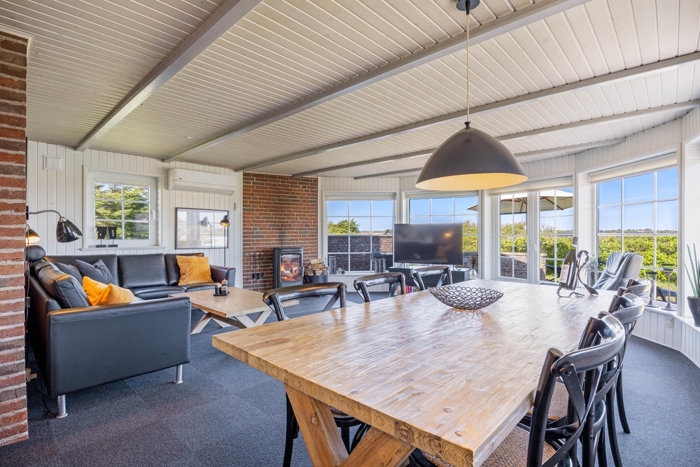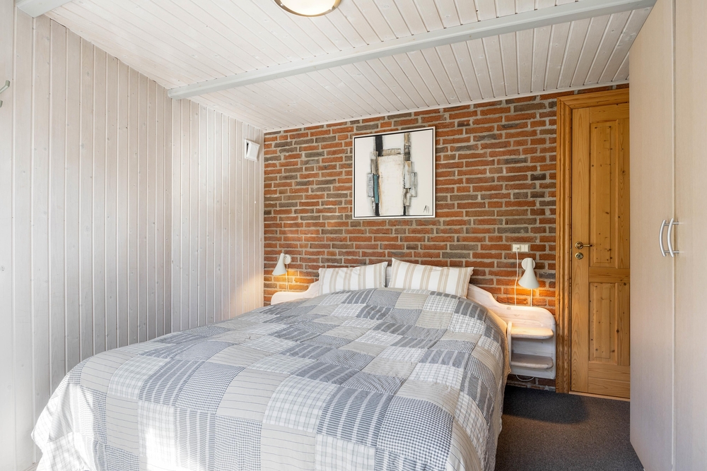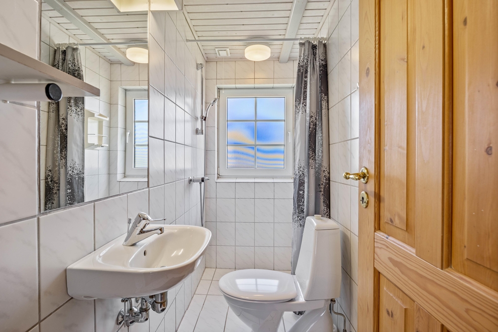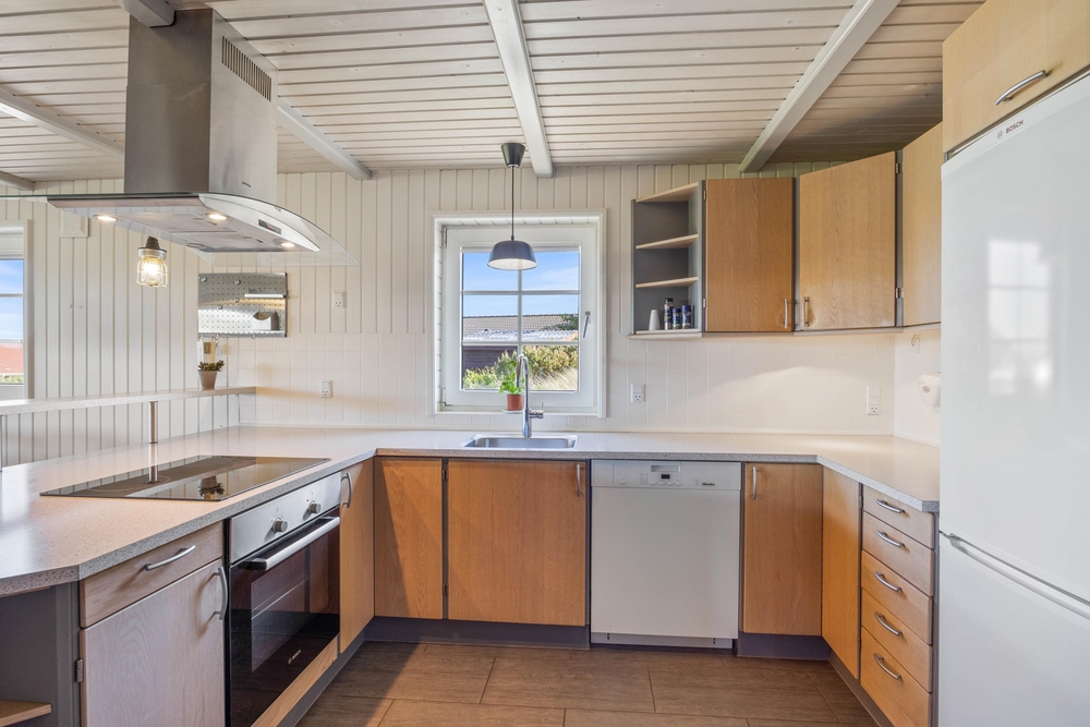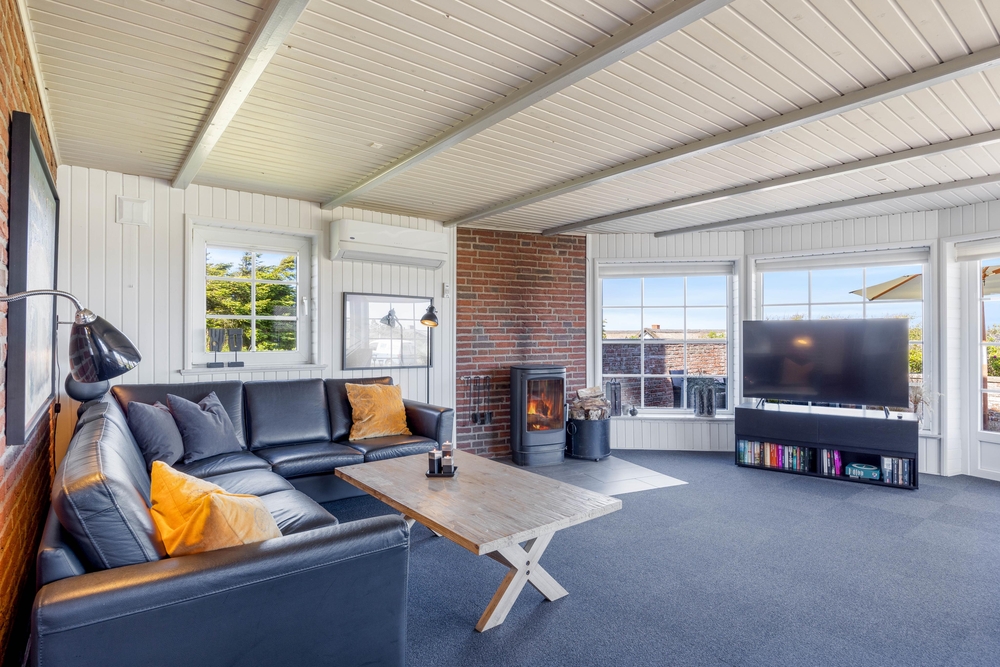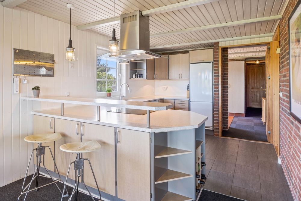 Das Wohnzimmer, die Küche und der Essbereich fließen in einem großen Wohnraum zusammen, der zweifellos der Mittelpunkt eures Urlaubs sein wird. Die Kombination aus rohen Ziegelwänden und hellen Täfelungen verleiht dem Haus seinen eigenen Charakter und seine Persönlichkeit. Von hier aus habt ihr den Blick nach Osten, wo ihr den Sonnenaufgang über dem Fjord genießen könnt. Das Wohnzimmer ist gemütlich eingerichtet mit guten Möbeln, einem schönen Ecksofa, einem Fernseher und einem Holzofen, und in der Küche findet ihr eine Spülmaschine und eine Mikrowelle.