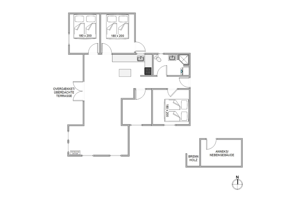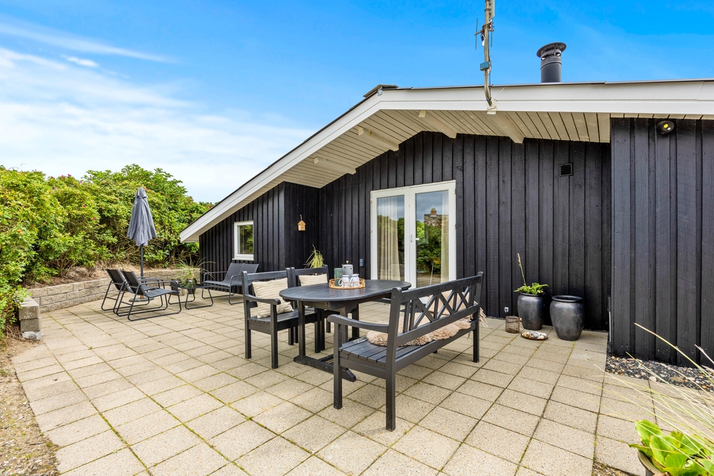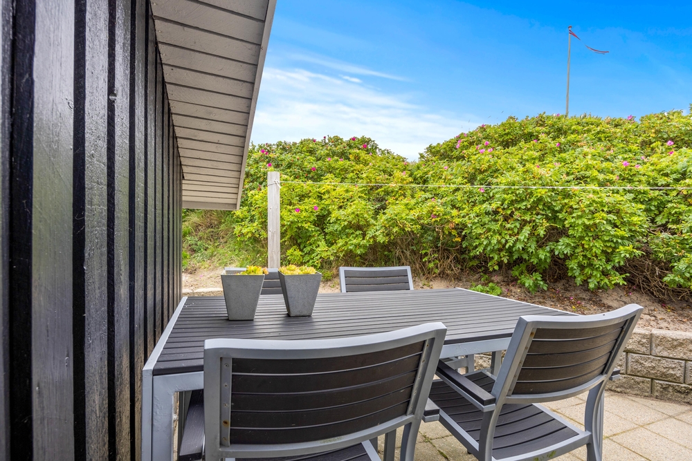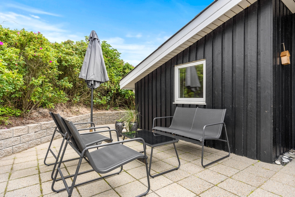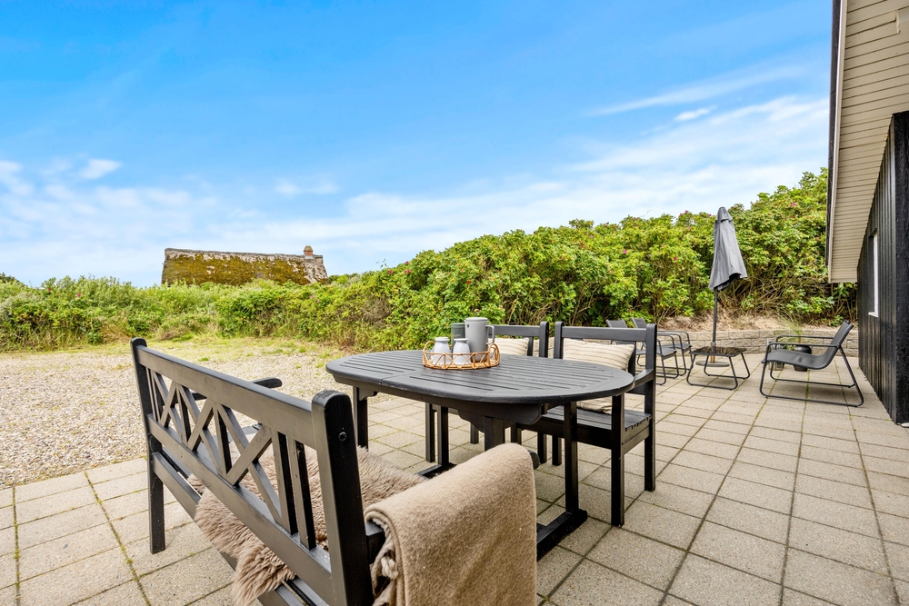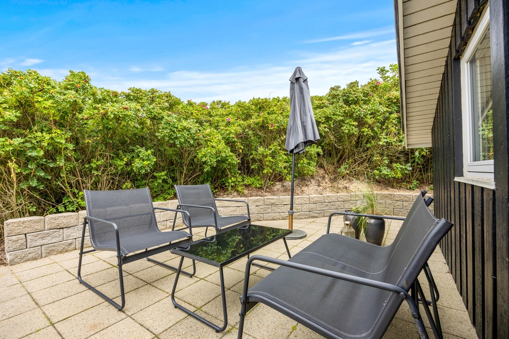 Die Terrasse des Hauses ist gut sichtgeschützt und hier könnt ihr euch entspannen. Sowohl ein Grill, Gartenmöbel als auch Liegestühle stehen euch hier zur Verfügung. Ebenso steht euch ein Schuppen zur Unterstellung von Gegenständen wie z. B. Strandutensilien bereit.
