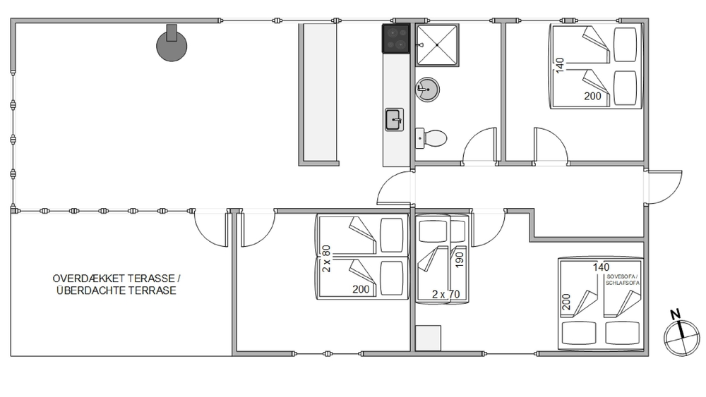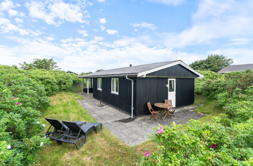 Vom Wohnzimmer aus gelangen Sie direkt auf die überdachte Terrasse, wo Sie Ihren Urlaub in vollen Zügen genießen können. Die hügeligen Dünen und die schönen Rosensträucher, die den größten Teil des Grundstücks umgeben, bieten Schutz und Privatsphäre.