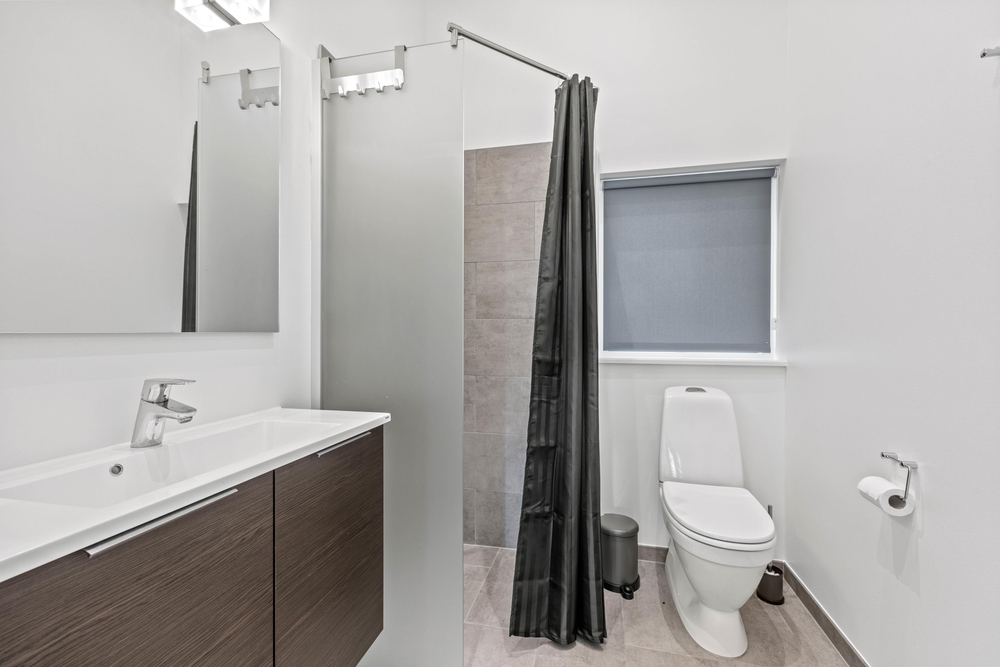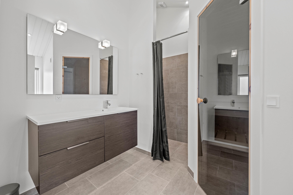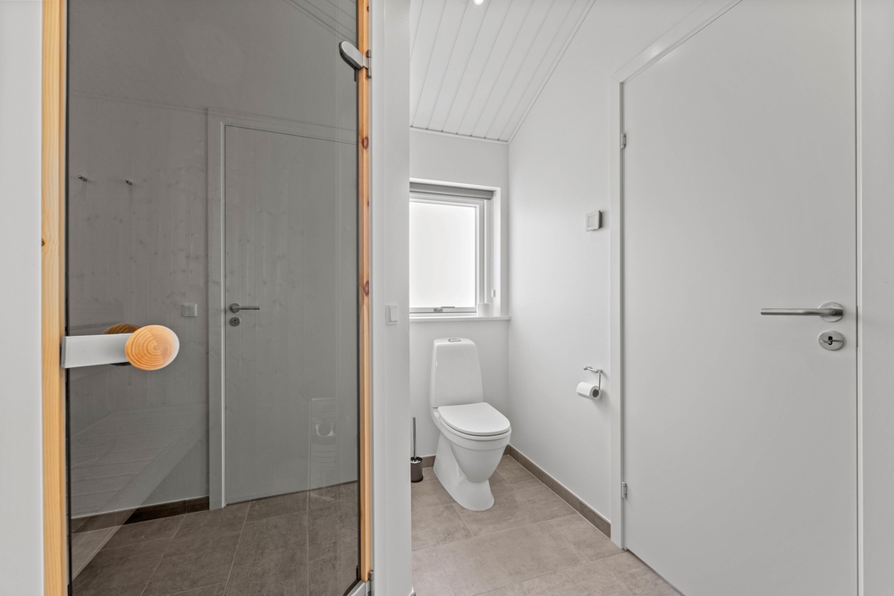 Das Ferienhaus verfügt über zwei Badezimmer mit Fußbodenheizung. In dem einen gibt es eine Sauna, die ganz fantastisch ist nach einem langen Spaziergang am Meer. Im Eingangsbereich stehen Waschmaschine und Trockner, sodass ihr Klamotten und Handtücher waschen könnt.