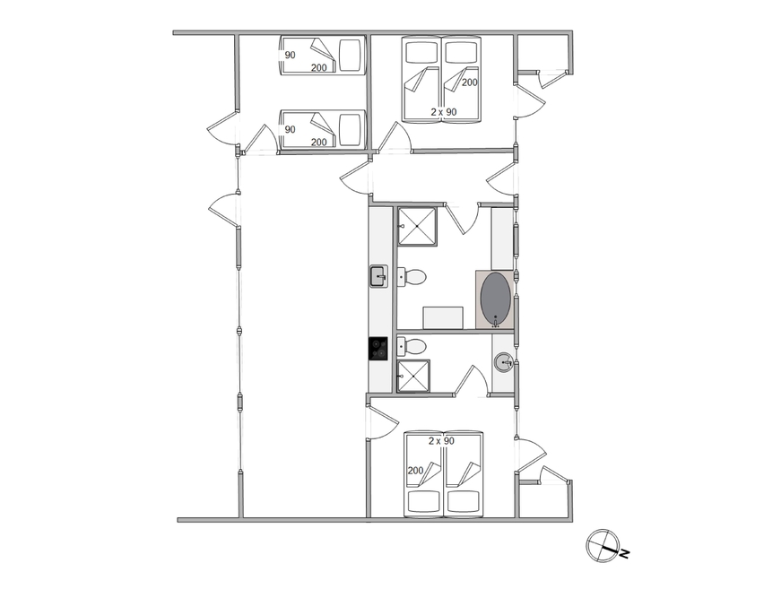 2 der Schlafzimmer sind mit einem Doppelbett und ein Schlafzimmer mit 2 Einzelbetten ausgestattet. Es befinden sich zwei Bäder in der Wohnung, wobei eines mit einer Waschmaschine und einer Badewanne bestückt ist.