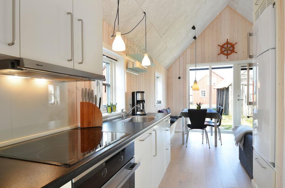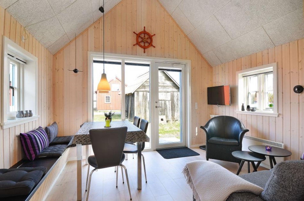Auch viele der umligenden Schuppen werden noch in Gebrauch genommen und diese waren eine Inspiration beim Errichten der Sommerhäuser am Hafen. Von Innen ist das Haus hell und modern mit guten und bequemen Möbeln eingerichtet.