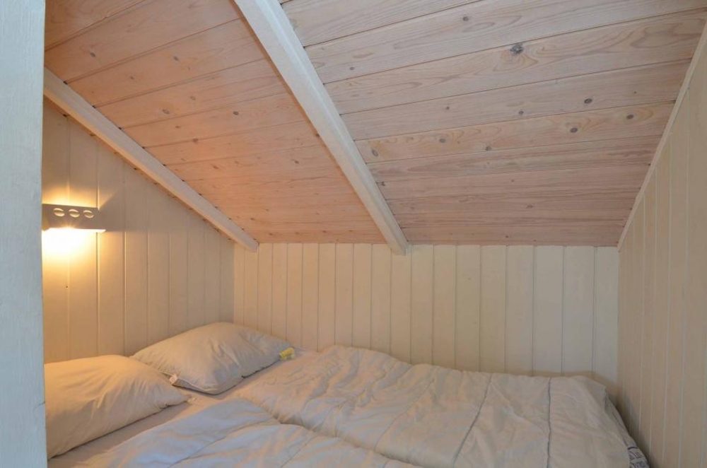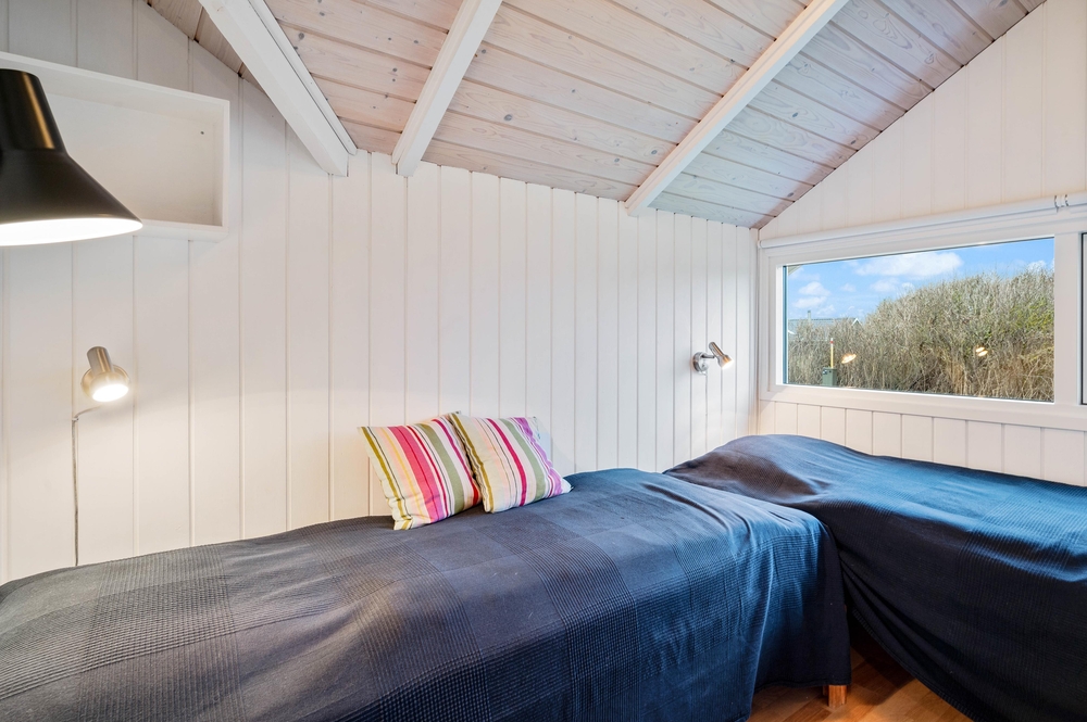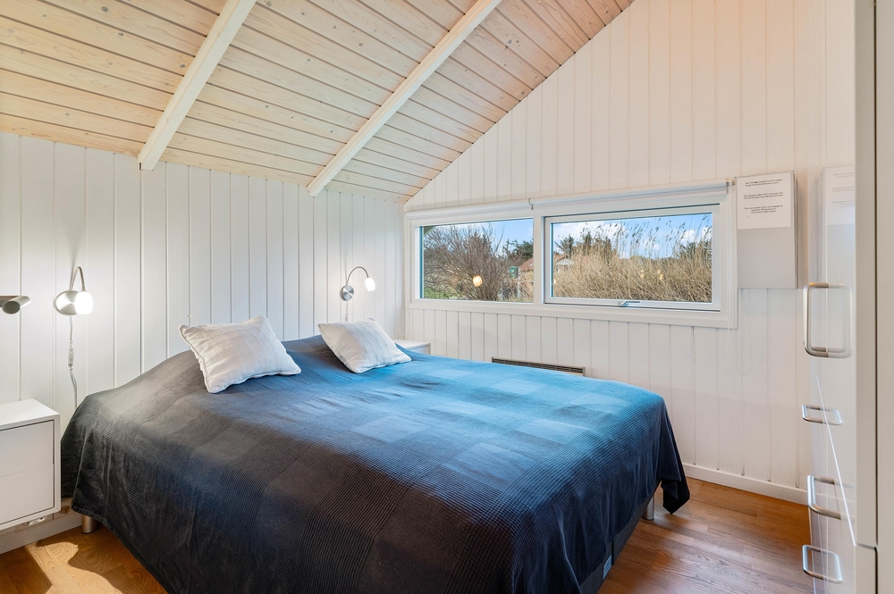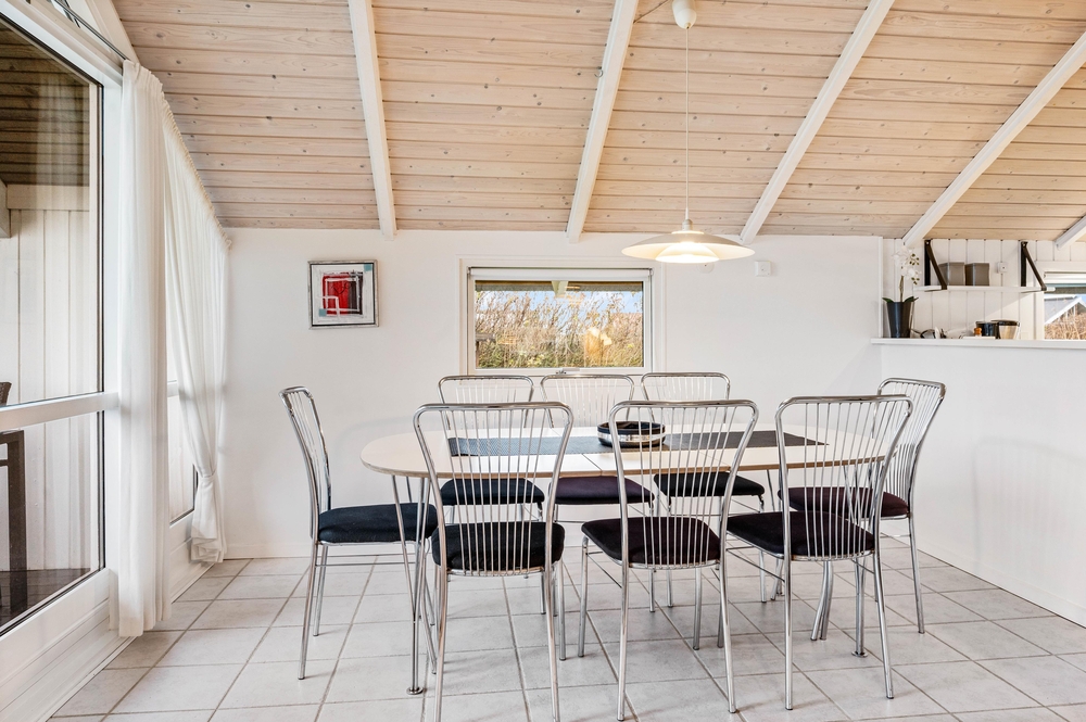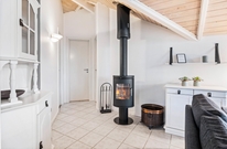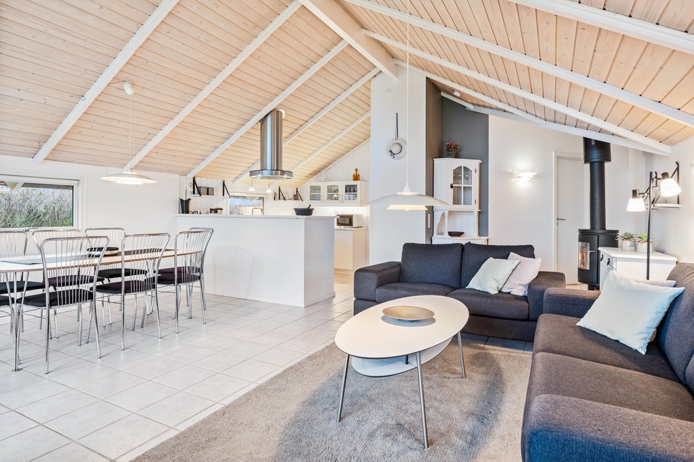 Das Wohnzimmer hat hohe Decken und bietet euch einen Kaminofen und einen Flachbildschirm-TV. Die deutschen Kanäle werden über Parabol empfangen, die dänischen über VIA Sat. Vom Wohnzimmer aus gelangt ihr auf die Terrasse, die nach Westen ausgerichtet ist. Nicht zuletzt gibt es auch eine Waschmaschine und einen Trockner im Ferienhaus.