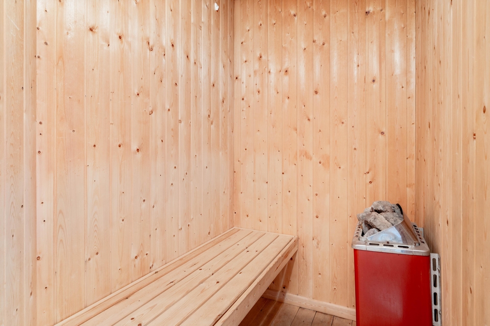 Im Ferienhaus gibt es ein großes Badezimmer mit einer schönen Dusche, angenehmer Fußbodenheizung sowie Whirlpool und Sauna. Außerdem gibt es eine Gästetoilette, wo der Boden auch beheizt ist.