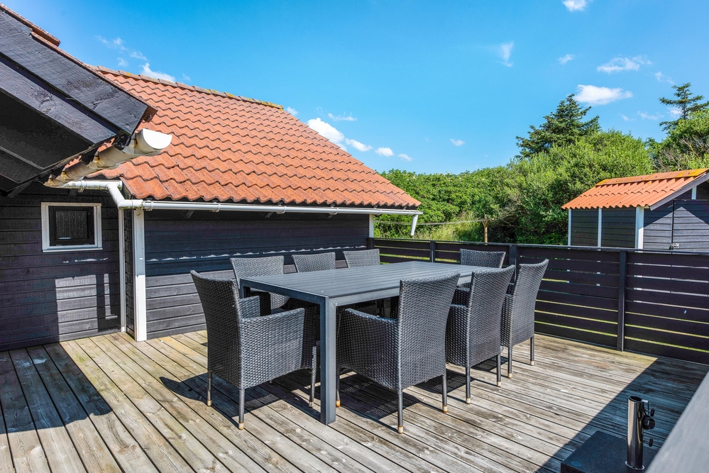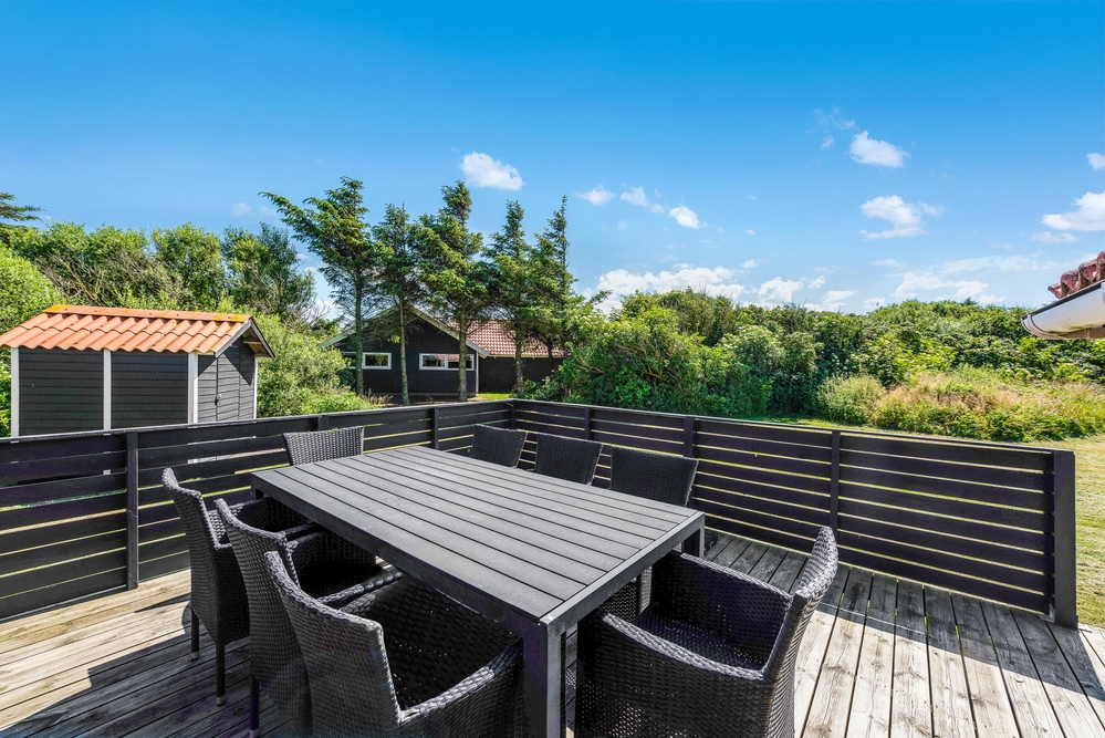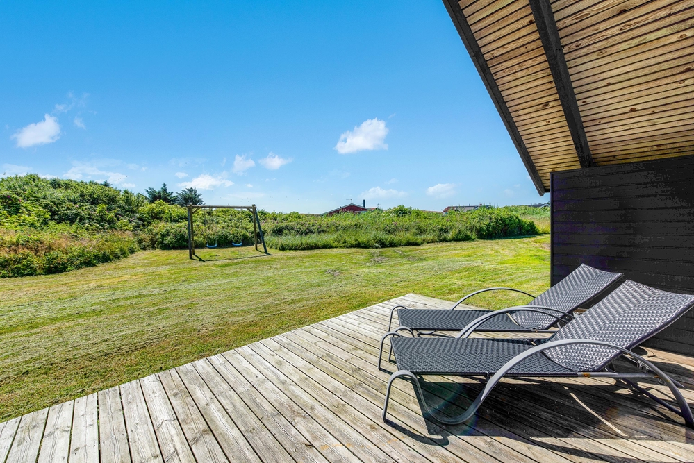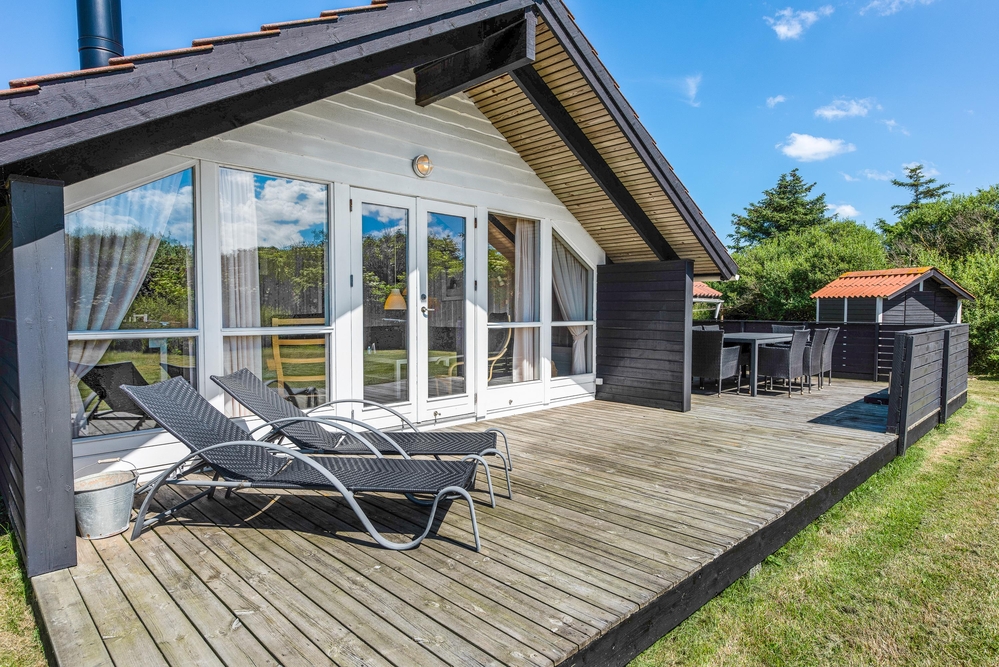 Auf der schönen, südwestlich ausgerichteten Terrasse des Ferienhauses, findet ihr bequem Gartenmöbel vor. Hier könnt ihr euch auf den Sonnenliegen sonnen oder euer Frühstück im Freien genießen. Dank der zahlreichen Büsche und Bäume rund um das Rasengrundstück, seid ihr hier ganz für euch. Auch ein leckeres BBQ könnt ihr auf dem hauseigenen Grill zaubern.