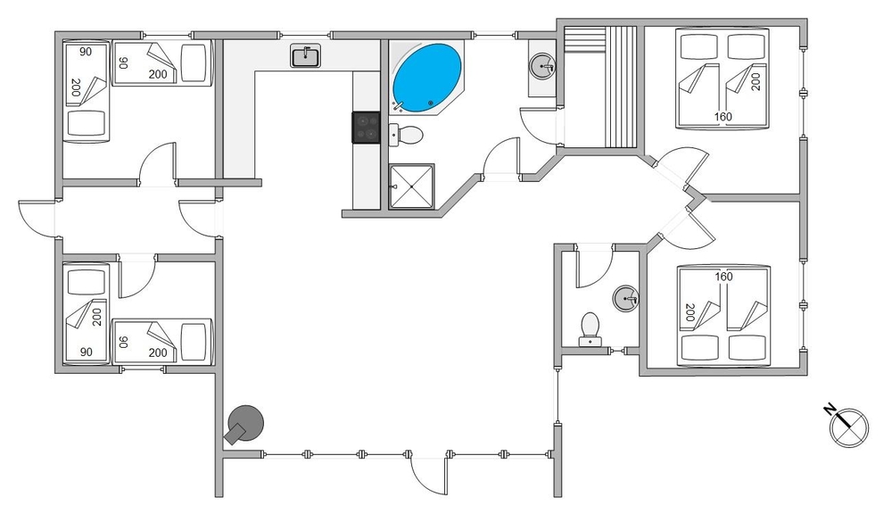 Nach dem Essen können eure Kinder fernsehen oder am Esstisch ein Brettspiel spielen, während ihr einen Saunagang macht oder euch im warmen Wasser des Whirlpools entspannt. Dank des zusätzlichen Gäste-WCs werdet ihr auch nicht gestört. Die praktisch eingerichteten Schlafzimmer befinden sich auf zwei unterschiedlichen Seiten des Ferienhauses. So könnt ihr euch gut aufteilen. Es stehen euch zwei Schlafzimmer mit Doppelbetten und zwei Schlafzimmer mit je zwei Einzelbetten zur Verfügung.