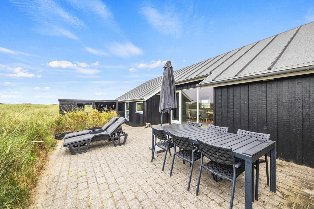 Die offene, abgeschirmte und teilweise überdachte Terrasse liegt mitten in den Dünen.