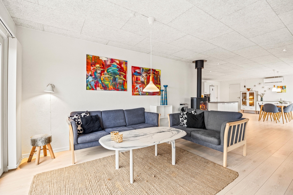 Schon beim Betreten des Ferienhauses werdet ihr die klassische Atmosphäre eines dänischen Ferienhausurlaubs spüren. Die Wände und Decken im gesamten Ferienhaus sind hell gestrichen, sodass man sich einfach wohlfühlen muss. Der Mittelpunkt in diesem schönen Ferienhaus wird sicherlich der gemütliche und helle Wohnbereich sein, in dem sich Wohnzimmer, Küche und Esszimmer in einem Raum befinden. Egal, wo man sich in diesem Bereich aufhält ? man hat immer einen großartigen Blick in Richtung Natur oder Strand.