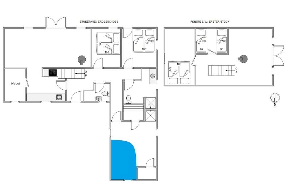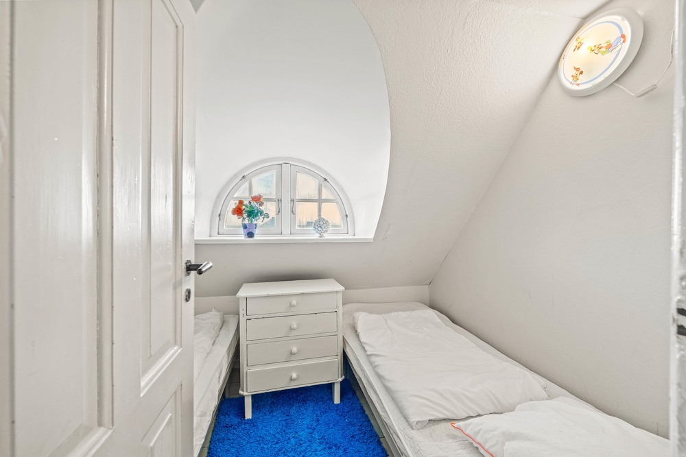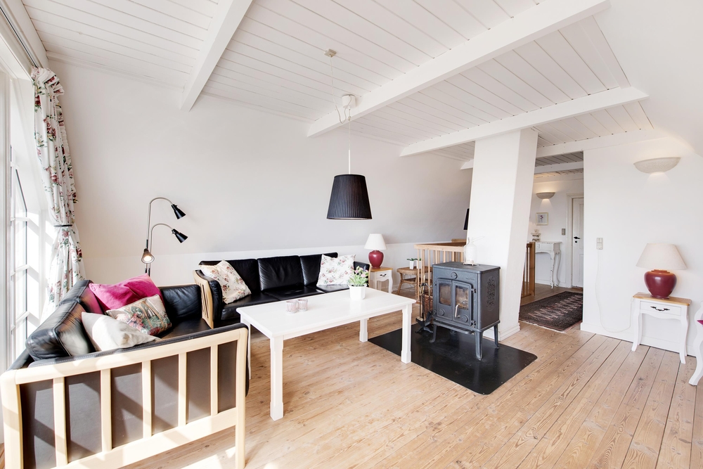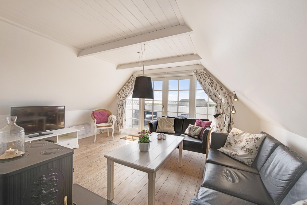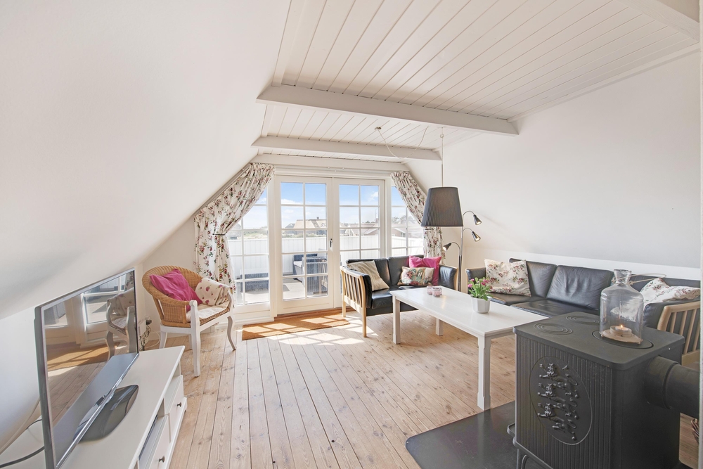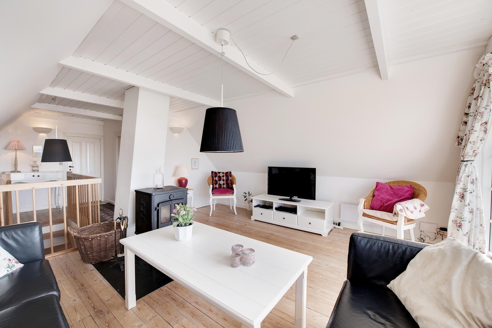 Die Wohnfläche verteilt sich auf zwei Etagen. Nostalgische Elemente sind mit modernen Einrichtungsgegenständen und technischen Geräten kombiniert. Im ersten Stock habt ihr eine wunderbare Aussicht auf Dünen und Meer.