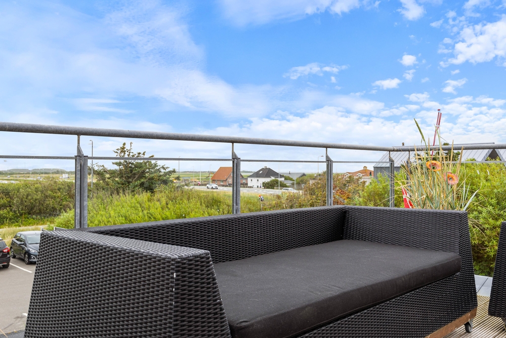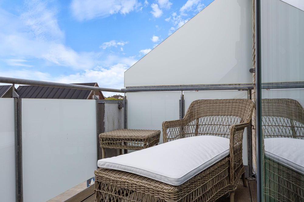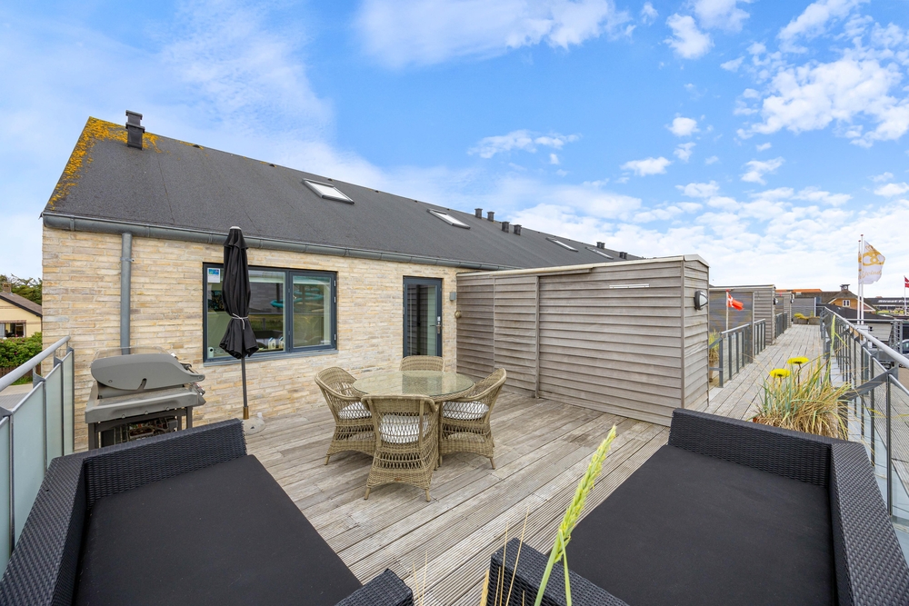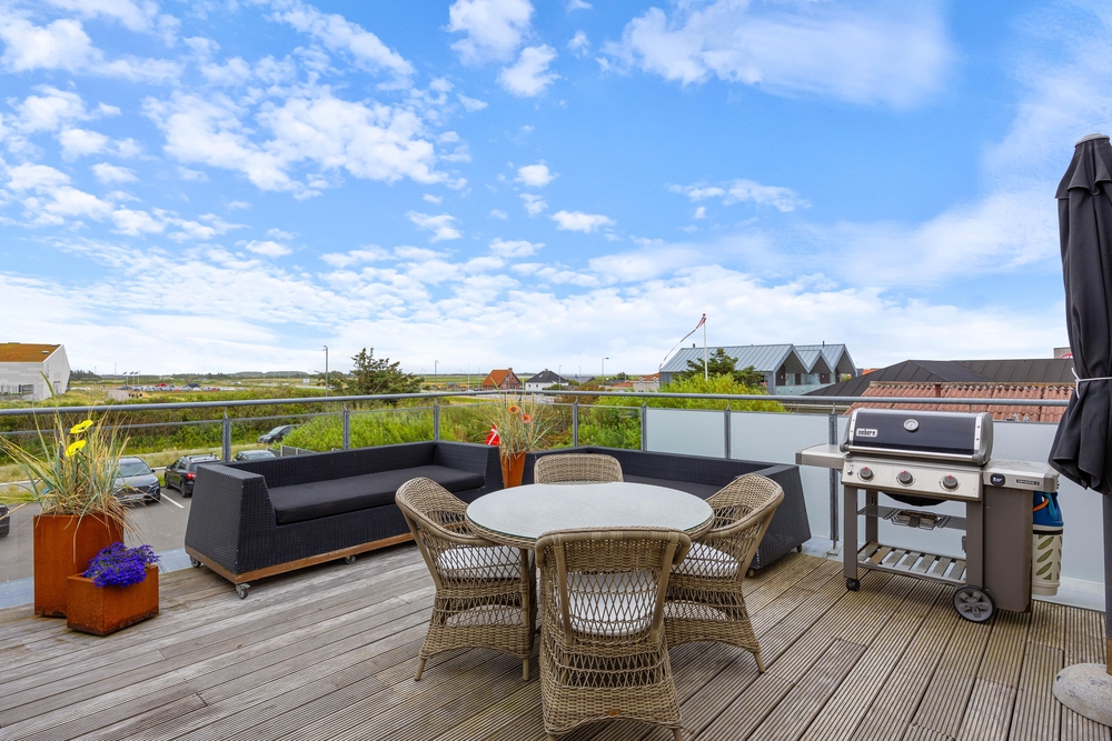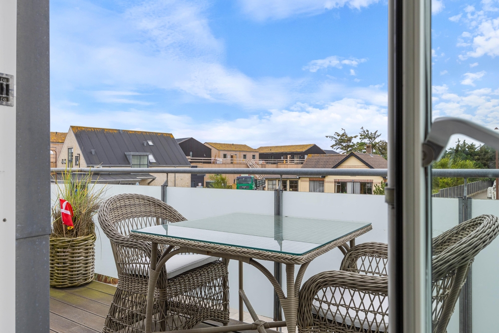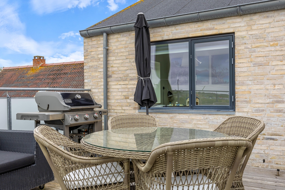 Vom Wohnraum der Ferienwohnung aus kommt ihr auf die offene und abgeschirmte Terrasse, von der aus ihr über das Treiben Søndervigs schauen könnt. Die Terrasse ist mit passenden Terrassenmöbeln ausgestattet, sodass ihr es euch hier gemütlich machen und die Sonne genießen könnt. Abends könnt ihr dann einen gelungenen Urlaubstag mit einem gemütlichen Grillabend vom Gasgrill ausklingen lassen.