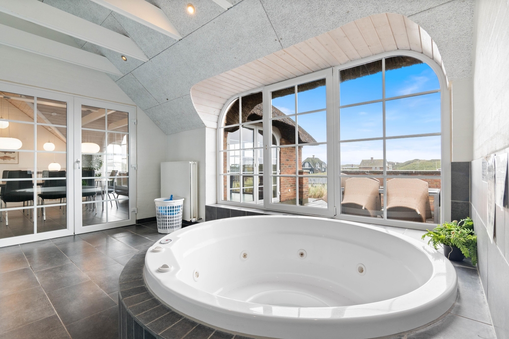 Vom Poolbereich mit Whirlpool habt ihr freien Blick auf eine der Terrassen und die umliegenden Dünen. Während ihr einfach einmal bei einer Tasse duftenden Kaffee entspannt, könnt ihr die Kinder durch eine Glastür zum Poolbereich im Auge behalten.