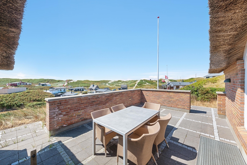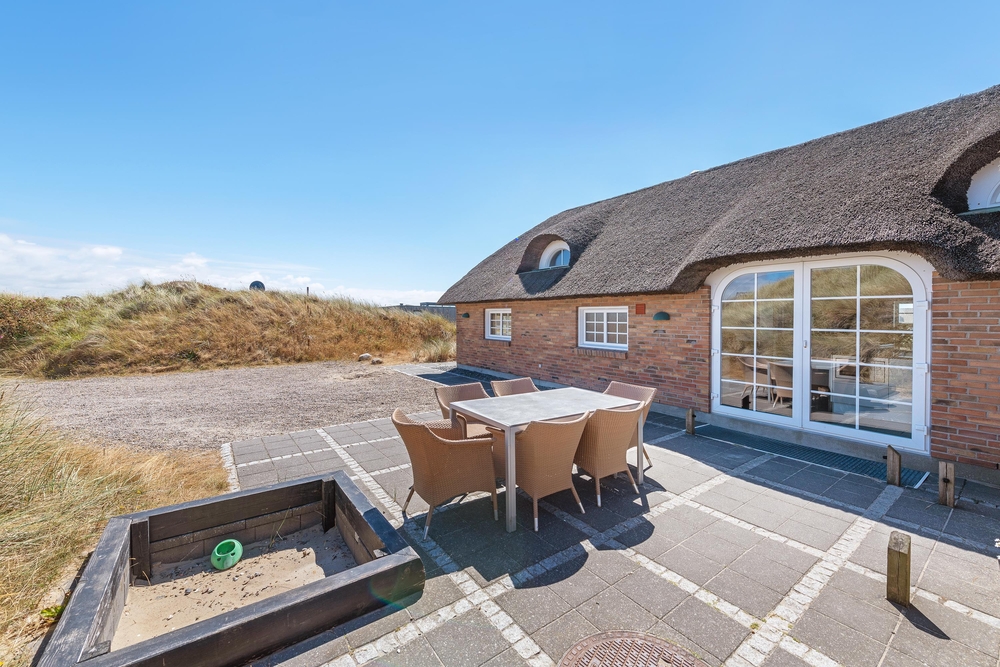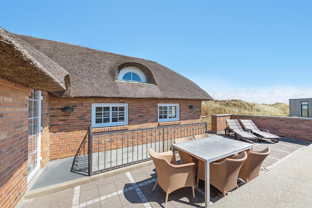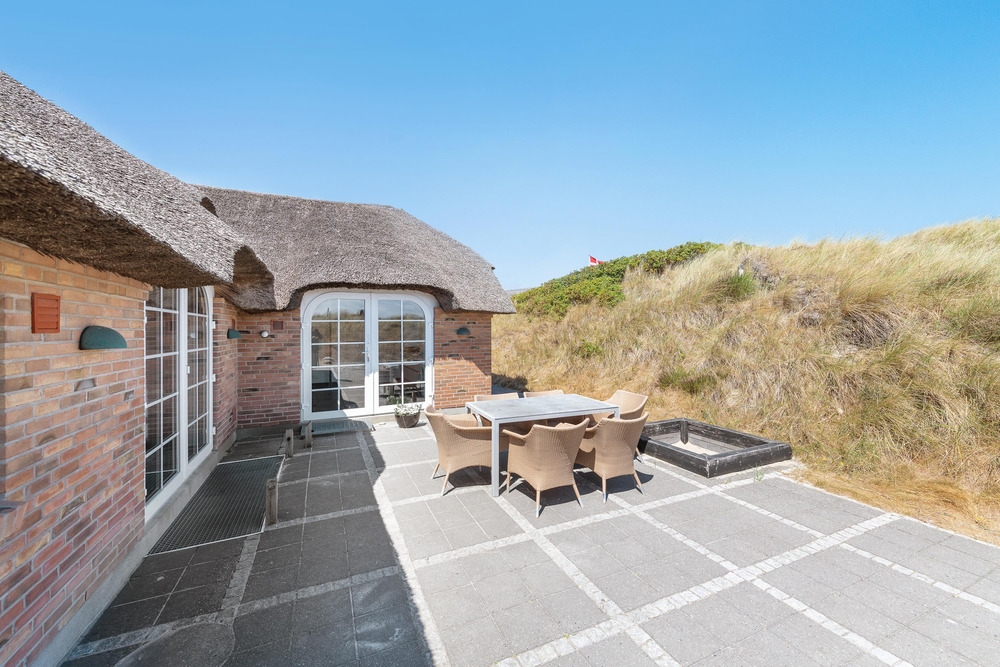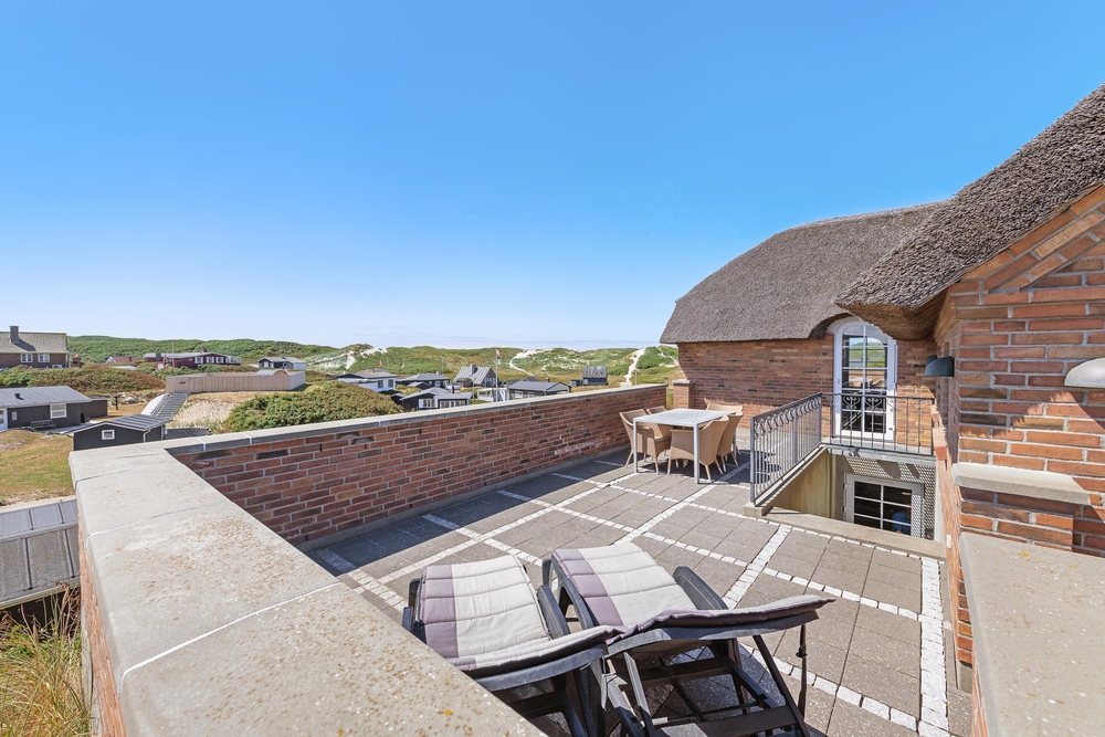 Um das Haus herum gibt es mehrere offene und geschützte Terrassen mit gemütlichen Sitzplätzen und Sonnenliegen. Ihr habt immer die Möglichkeit, die Sonnenstrahlen und auch den Sonnenuntergang zu genießen. Solltet ihr auf der Terrasse sitzen und die umliegenden Dünen im Wind beobachten, könnt ihr dem Meeresrauschen lauschen.