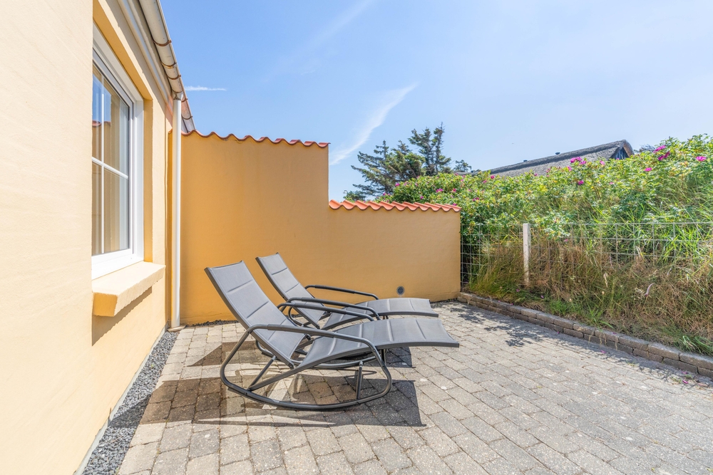 An sonnigen Tagen könnt ihr vom Wohnzimmer aus auf die Terrasse gehen. Hier könnt ihr es euch auf den Gartenmöbeln und Liegestühlen gemütlich machen und das gute Wetter genießen. Die Terrasse ist nach Süden ausgerichtet, sodass ihr die meiste Zeit des Tages die Sonne genießen könnt. Auf der Terrasse gibt es auch einen Grill, auf dem ihr euch Mahlzeiten zubereiten könnt.