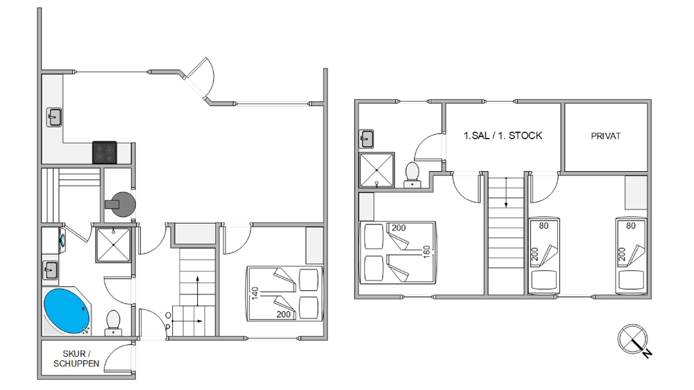 Es gibt 2 Badezimmer, die mit einer Fußbodenheizung ausgestattet sind. Das große Badezimmer im Erdgeschoss erwartet euch mit einem Whirlpool und einer Sauna, damit ihr euch so richtig entspannen und den Alltagsstress vergessen könnt.