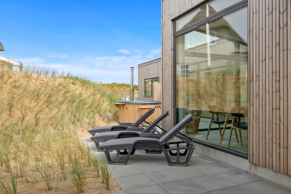 Im Außenbereich des Ferienhauses könnt ihr euch auf sonnige Urlaubstage auf der großen, teilweise überdachten und abgeschirmten Terrasse freuen. Auf der Terrasse kann man es sich in Gartenmöbeln und Liegestühlen gemütlich machen und dem Rauschen der Brandung im Hintergrund lauschen.