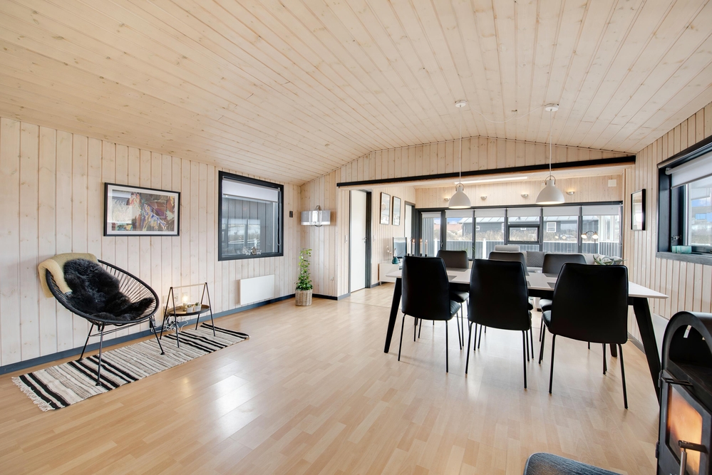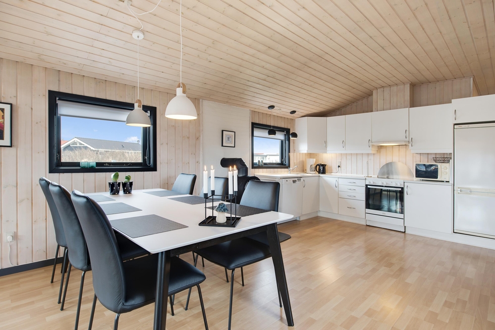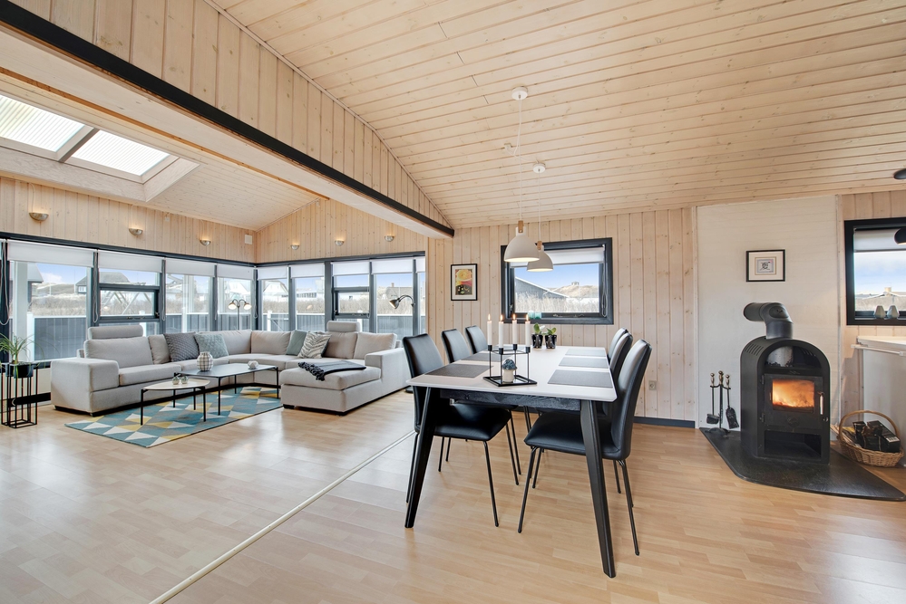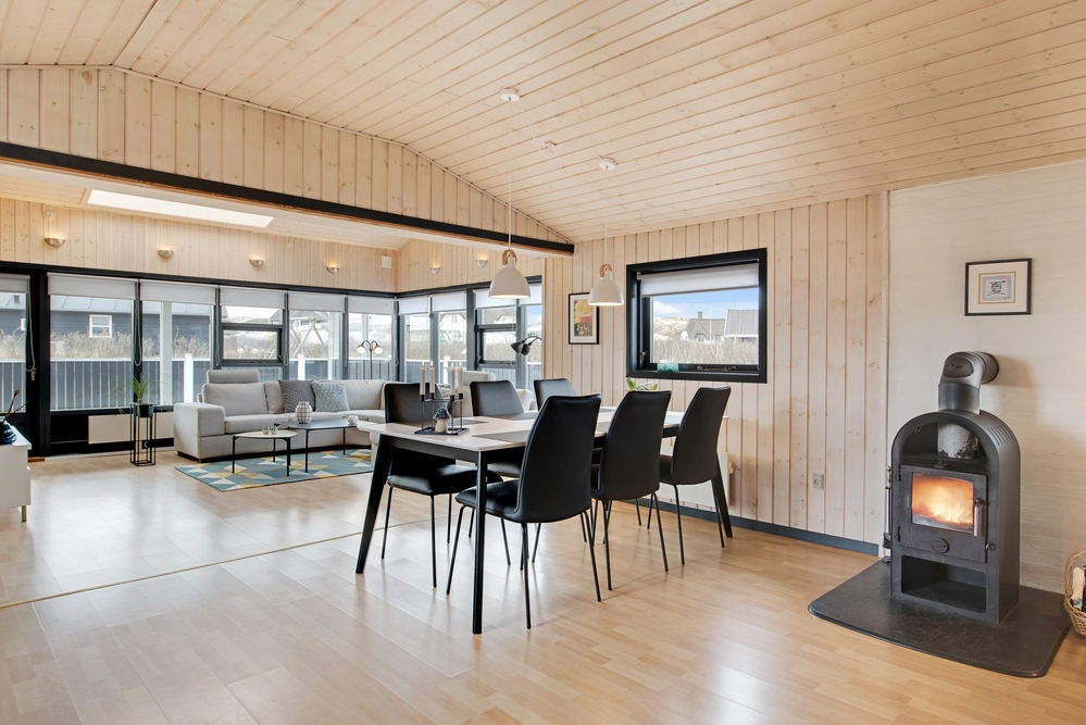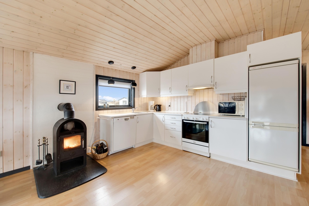 Die Küche und der Essbereich sind in einem großen Wohnraum zusammengefasst, in dem ihr euch gemütlich unterhalten und Spiele spielen könnt und gleichzeitig etwas Leckeres zu Essen zubereiten könnt. Am Abend oder an kühleren Tagen sorgt der Holzofen für kuschelige Wärme und zusätzliche Urlaubsstimmung. Alternativ steht euch auch eine modernen Wärmepumpe zur Verfügung, um für angenehme Temperaturen zu sorgen.
