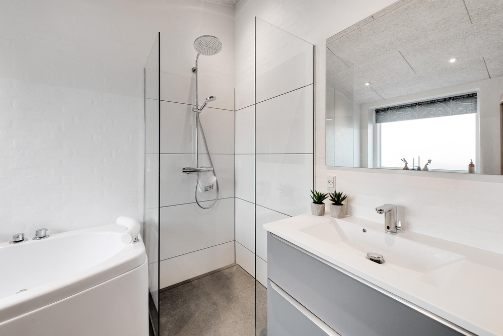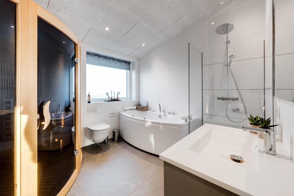 Im größeren der zwei mit Fußbodenheizung ausgestatteten Badezimmer befindet sich die Wellness-Oase mit dem Whirlpool und der Infrarotsauna. Nach einem langen Tag am Strand oder einem langen Spaziergang mit dem Hund kannst du dich hier wieder aufwärmen. Im Ferienhaus gibt es außerdem eine Geschirrspülmaschine, eine Waschmaschine und einen Wäschetrockner, damit euch so viel Arbeit wie nur möglich abgenommen wird.