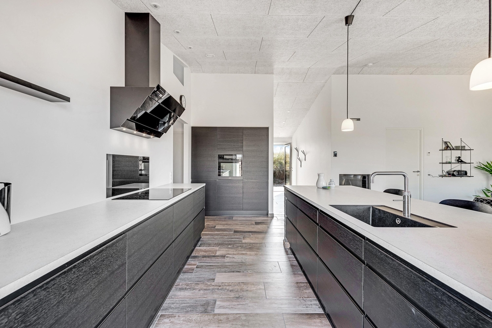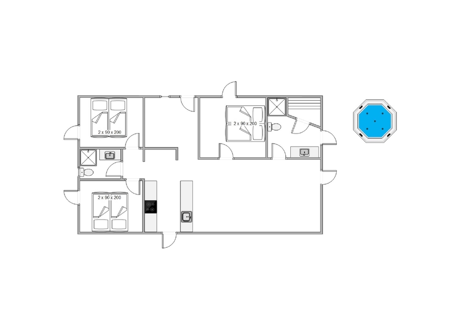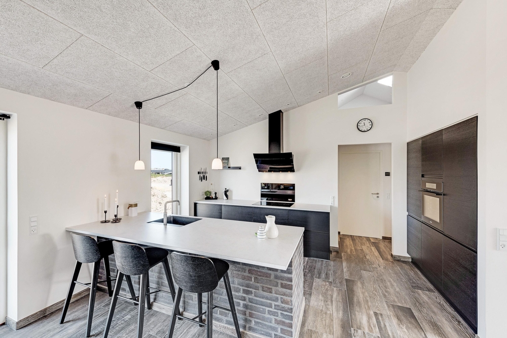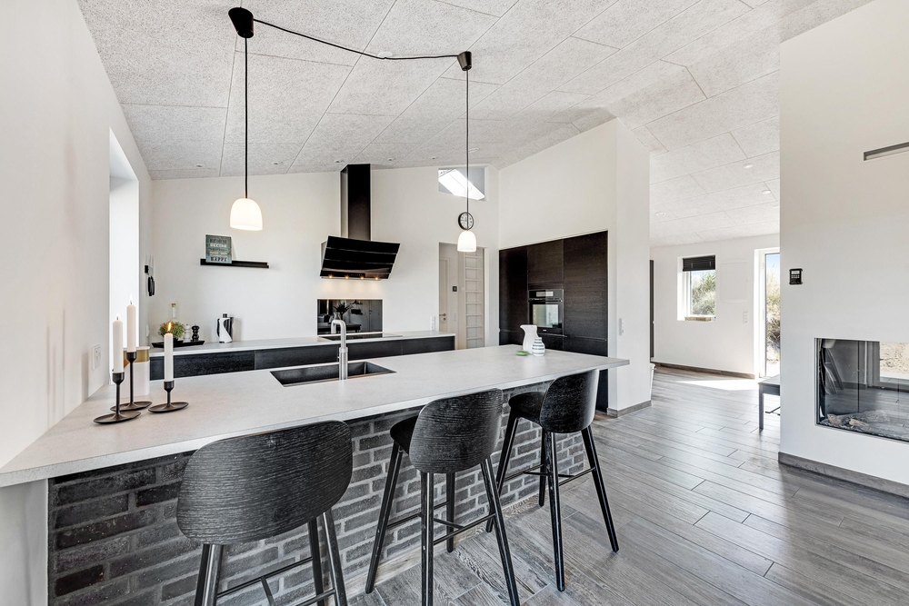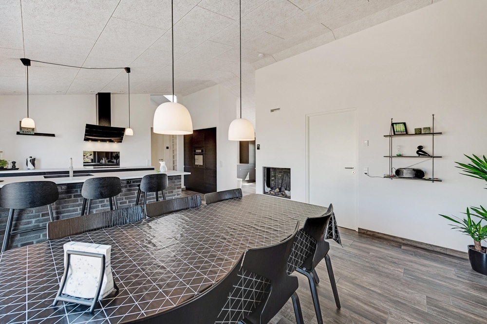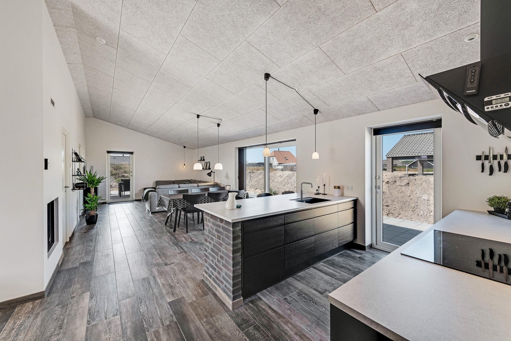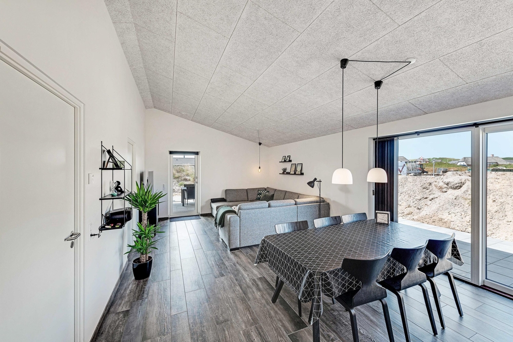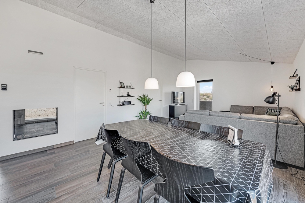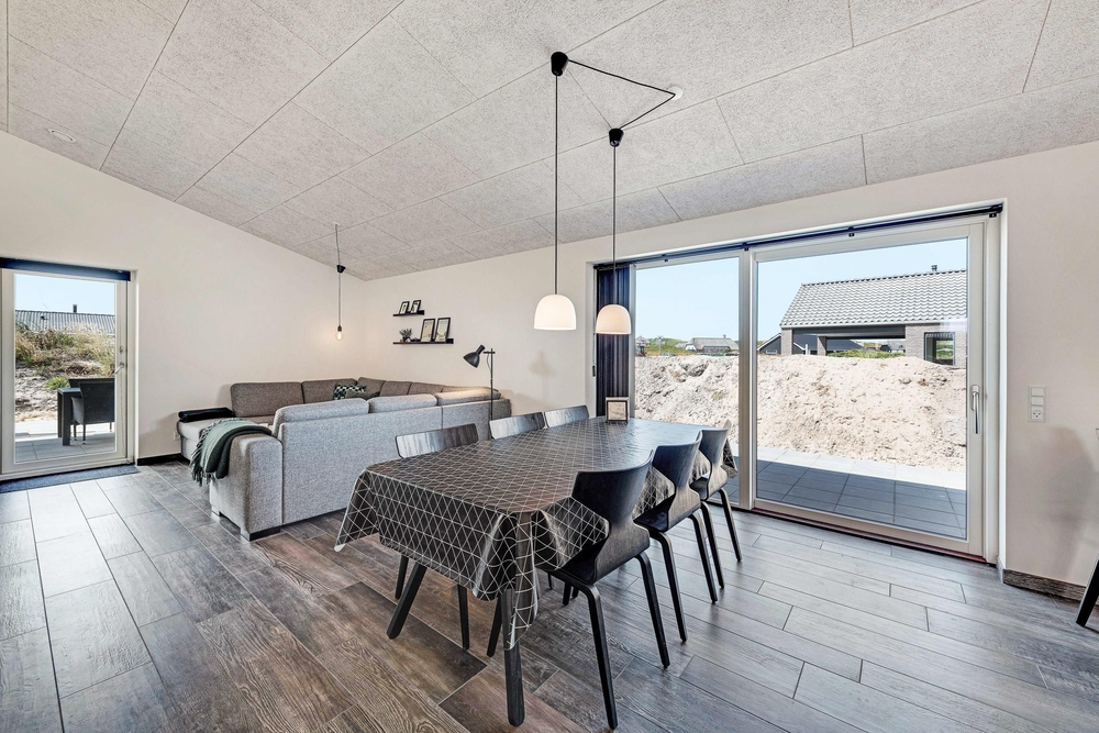 Dieses Ferienhaus bietet Platz für bis zu 6 Personen und ist gut ausgestattet. Die 125 qm² Wohnfläche bieten reichlich Platz für alle Bewohner des Hauses. Der geräumige lichtdurchflutete Wohnraum ist mit der gut ausgestatteten Küche kombiniert. Hier könnt Ihr gemeinsam die leckersten Ferienmahlzeiten zubereiten und die Spülmaschine erledigt im Anschluss den Abwasch, damit ihr mehr Zeit für die angenehmen Dinge des Tages habt. Ein Kamineinsatz sorgt für eine behagliche Ferienhausatmosphäre, während ihr am Esstisch einen lustigen Spieleabend veranstaltet oder auf dem Sofa entspannt. Im Ferienhaus ist fast überall eine Fußbodenheizung vorhanden.