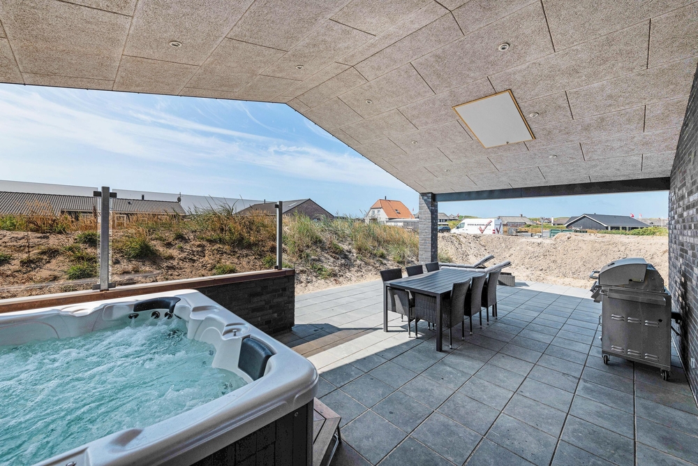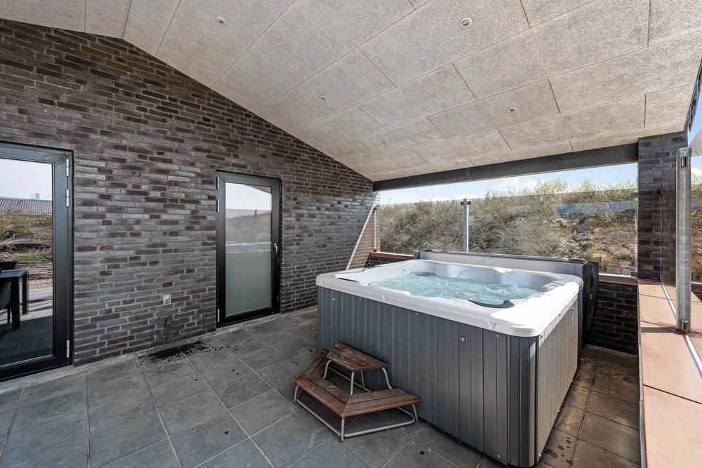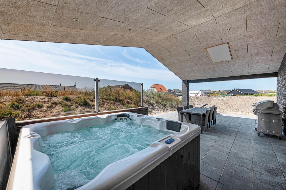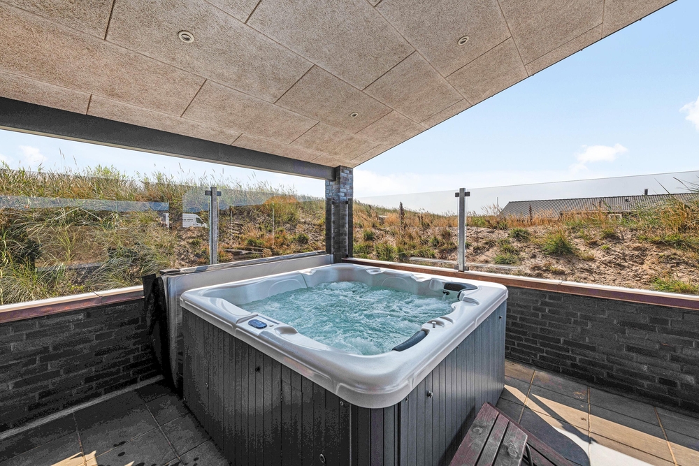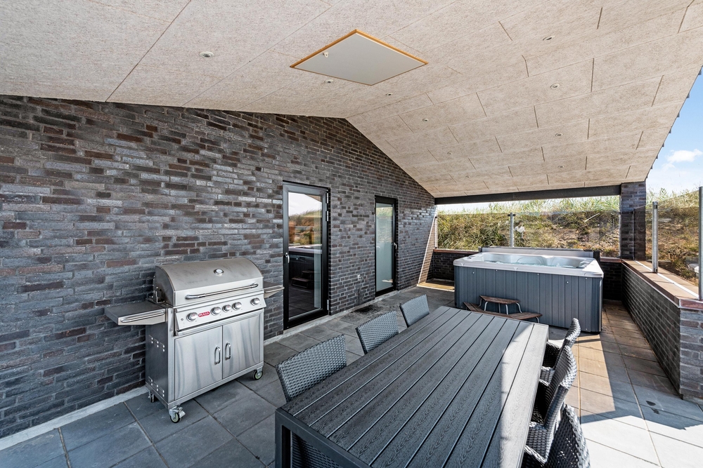 Vom Wohnraum aus habt ihr Zugang zur teilweisen überdachten Terrasse. Hier findet ihr einen Außenwhirlpool der zum Baden unter freiem Himmel einlädt. Egal zu welcher Jahreszeit könnt ihr hier die frische Nordseeluft genießen, während ihr euch im warmen Wasser entspannt. Die überdachte Terrasse ist wunderbar für ein leckeres BBQ geeignet. Der Gasgrill im Haus muss an den ?Gasanschluss? auf der Terrasse angeschlossen werden. Daher wird keine Gasflasche benötigt.