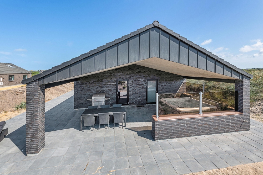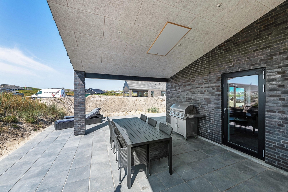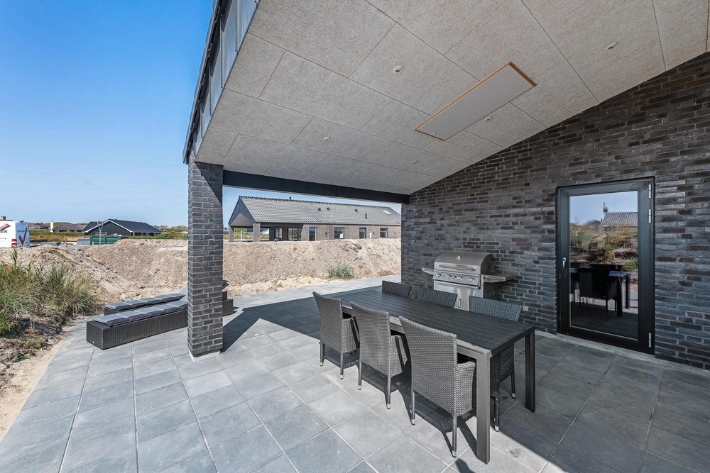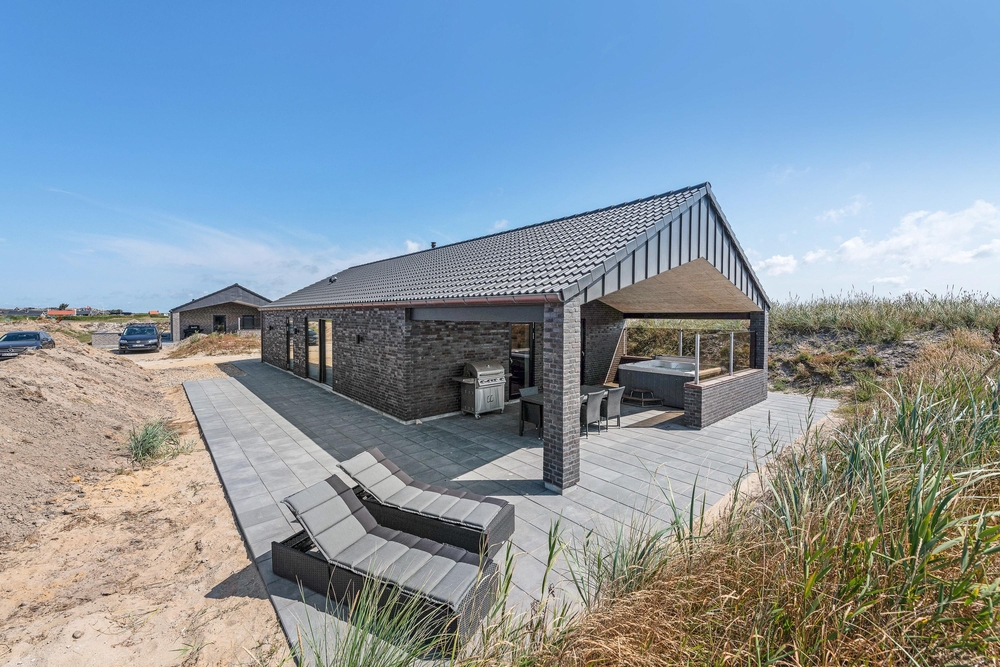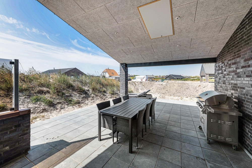 Vom Wohnraum aus habt ihr Zugang zur teilweisen überdachten Terrasse. Hier findet ihr einen Außenwhirlpool der zum Baden unter freiem Himmel einlädt. Egal zu welcher Jahreszeit könnt ihr hier die frische Nordseeluft genießen, während ihr euch im warmen Wasser entspannt. Die überdachte Terrasse ist wunderbar für ein leckeres BBQ geeignet. Der Gasgrill im Haus muss an den ?Gasanschluss? auf der Terrasse angeschlossen werden. Daher wird keine Gasflasche benötigt.