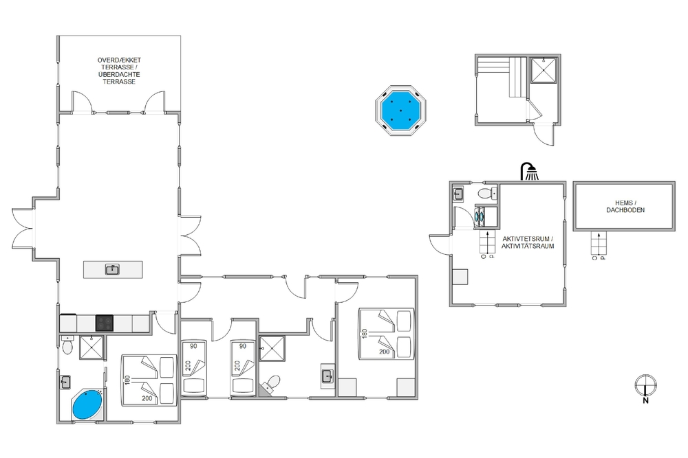 Dieses Haus ist mit 2 Bädern ausgestattet, und im einem befindet sich eines der Highlights des Hauses, nämlich der Whirlpool. Eine Außensauna ist separat im Außenbereich gebaut, sodass ihr nach einem langen Strandspaziergang oder an einem frostigen Wintertag, die wohlige Hitze genießen könnt. Dort findet ihr auch den Außenwhirlpool, welcher ganzjährig nutzbar ist und entspannte Stunden unter dem Sternenhimmel verspricht! Probiert es aus.