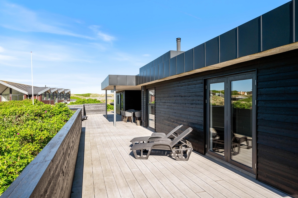 Des Weiteren verfügt das Ferienhaus über eine große Terrasse, die teilweise eingezäunt ist und so vor dem schlimmsten Wind schützt. Die Terrasse ist auch teilweise überdacht, wenn ihr euch vor der Sonne schützen möchtet. So habet ihr viel Platz auf der großen Terrasse und nicht zuletzt eine unbeschreibliche Aussicht auf die westjütländische Landschaft. Natürlich verfügt das Ferienhaus über verschiedene Gartenmöbel, Sonnenliegen und einen Grill, der ideal für die Sommerabende ist.