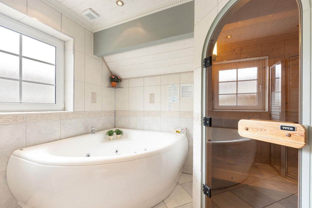 Im Erdgeschoss findet ihr eines der drei Schlafzimmer, welches mit 2 Einzelbetten ausgestattet ist. Das große Badezimmer beherbergt auch unsere geliebten Alltagshelfer, die Waschmaschine und den Trockner, welche schon vor der Abreise dafür sorgen, das Reisegepäck zu reduzieren. Hier wie auch im Wohnbereich befindet, sich eine Fußbodenheizung, womit kalte Füße kein Thema sind. Nach einem langen Strandsparziergang könnt ihr euch wunderbar in dem 2-Personen-Whirlpool entspannen.