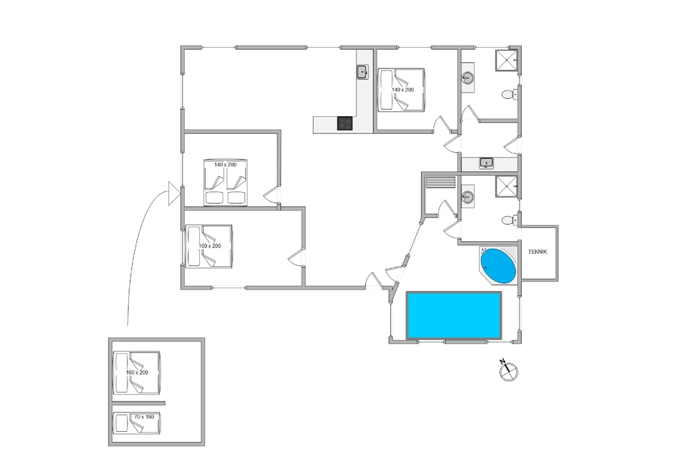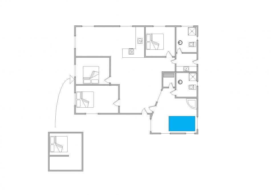 Es befinden sich 3 Schlafzimmer mit Doppelbetten im Erdgeschoss, darüber gibt es noch ein Zimmer mit 2 Schlafplätzen. Das Haus verfügt über 2 Badezimmer mit Fußbodenheizung und Dusche. Das eine Badezimmer befindet sich im Poolbereich, wo auch die Sauna und der Whirlpool platziert sind.