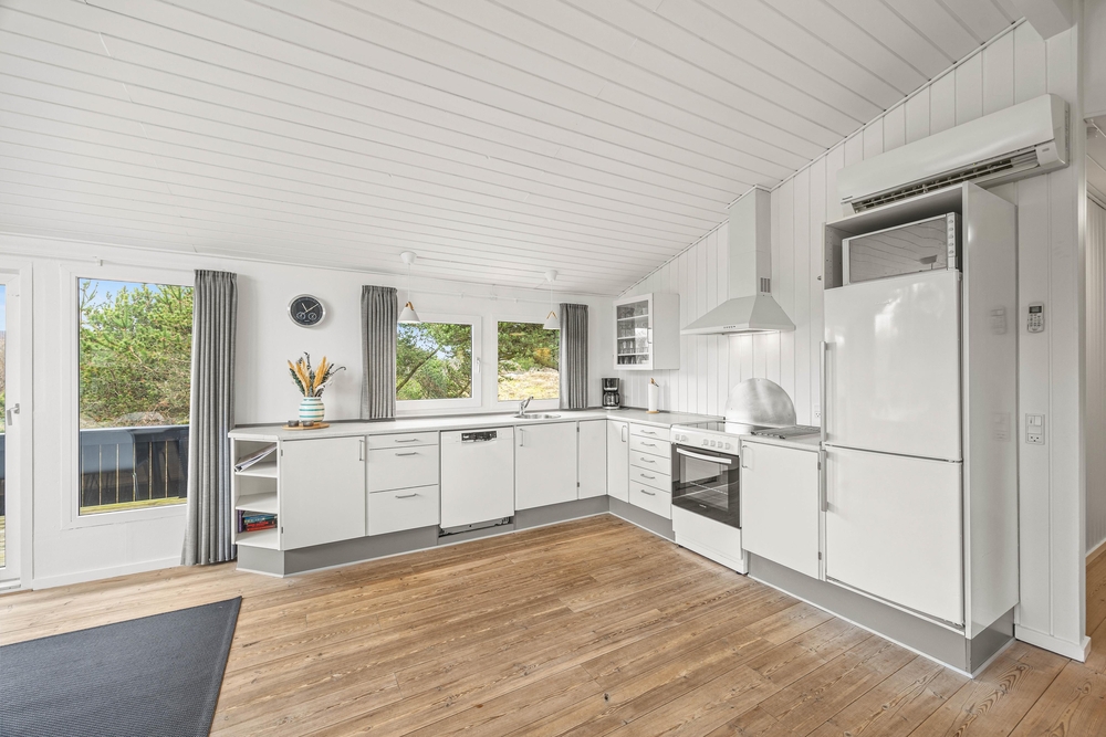 Euer schönes Ferienhaus wurde im Jahre 2023 renoviert und erstrahlt nun in hellen und natürlichen Farben, welche gut mit den Holzböden und den gemütlichen Möbeln harmonieren. Im Wohnraum könnt ihr es euch vor dem Kaminofen bequem machen, Fernsehen und die Zeit mit eurer Familie oder mit Freunden genießen. In der offenen und gut ausgestatteten Küche könnt ihr gemeinsam leckere Gerichte zubereiten. Der Geschirrspüler kümmert sich danach um den Abwasch.