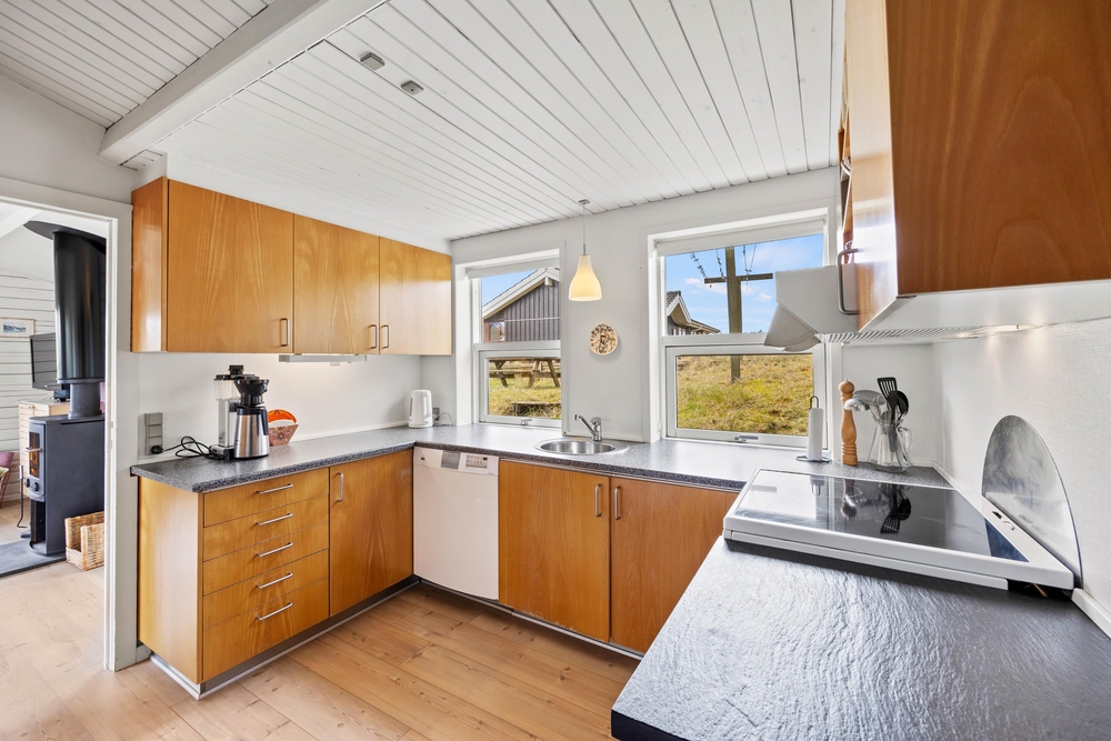 Der Holzofen sorgt für eine natürliche Wärme und abends für eine gemütliche Abendstimmung. Morgens, wenn der Kamin noch nicht entfacht wurde, dient die energiesparende Wärmepumpe als kostengünstige Wärmequelle. In der gemütlichen Küche, direkt angrenzend am Wohnbereich, findet ihr u. A. einen Kühlschrank mit Gefrierfach, eine Mikrowelle und eine Spülmaschine vor.