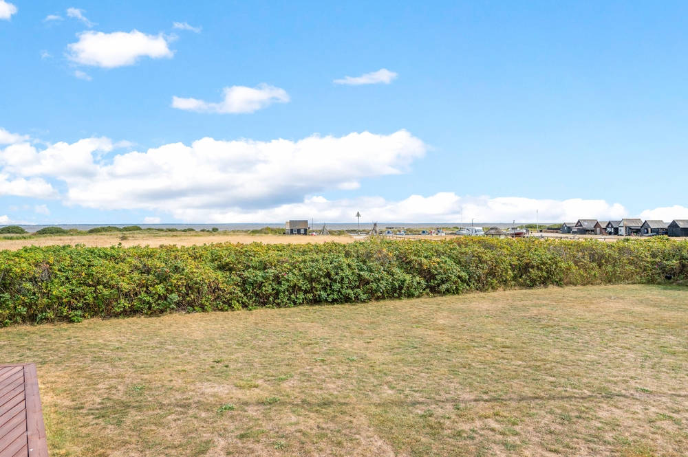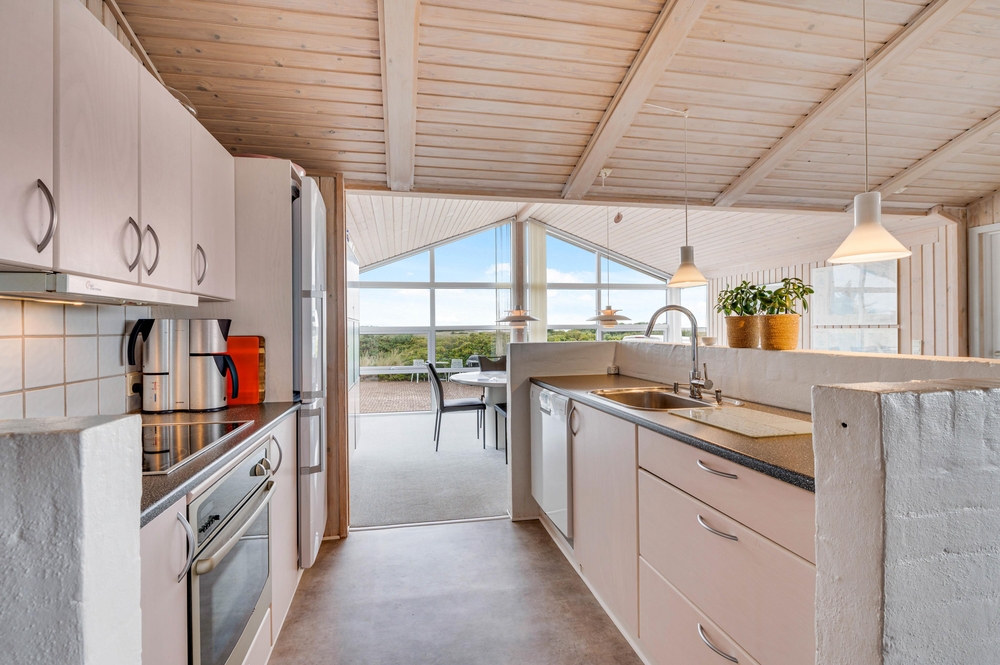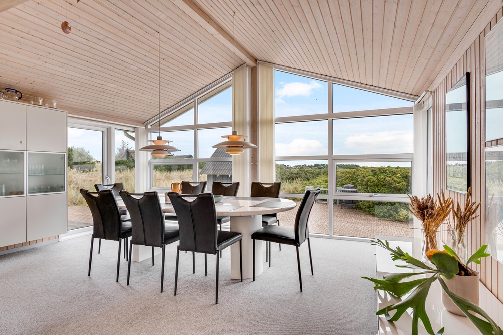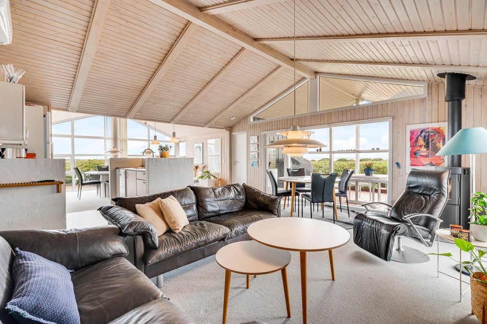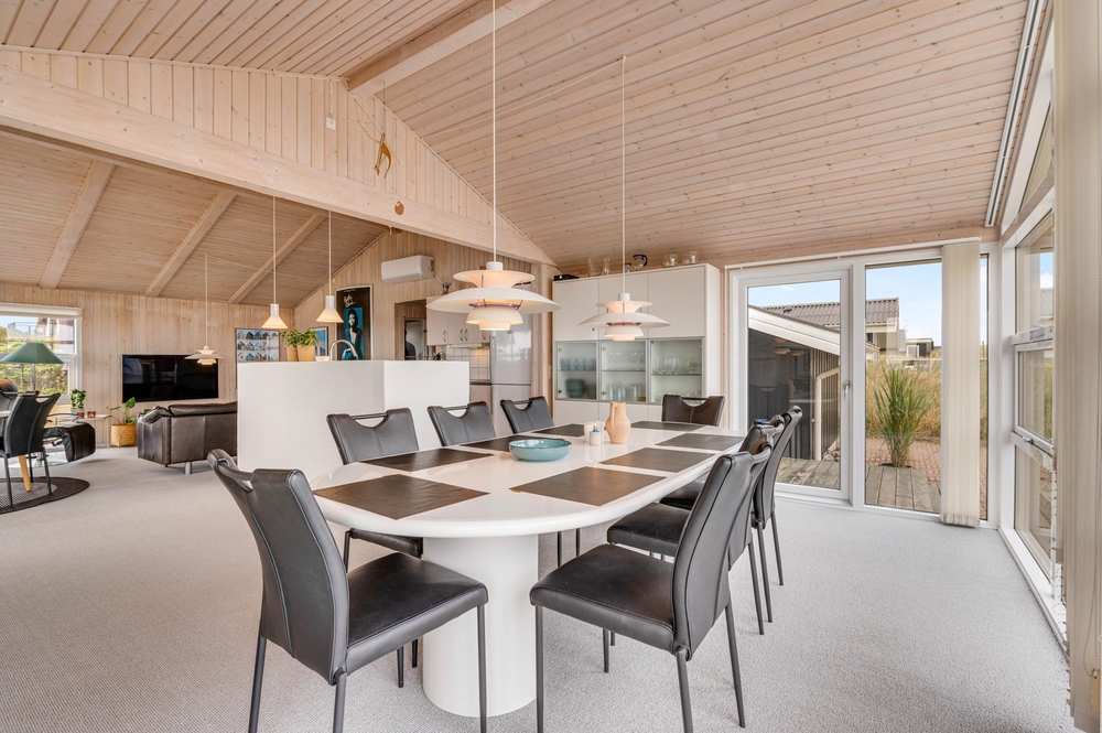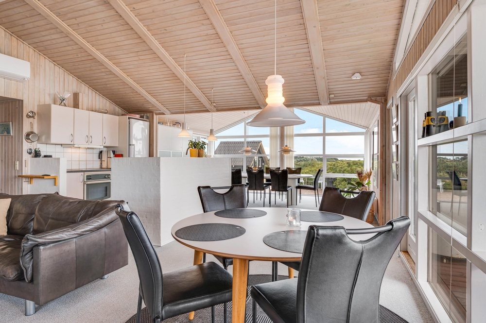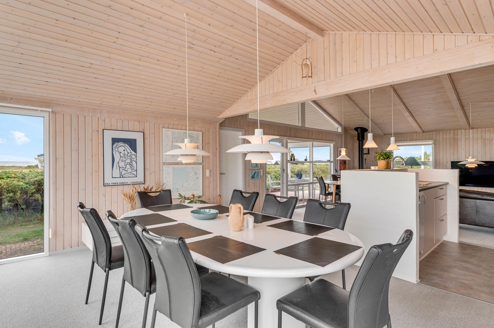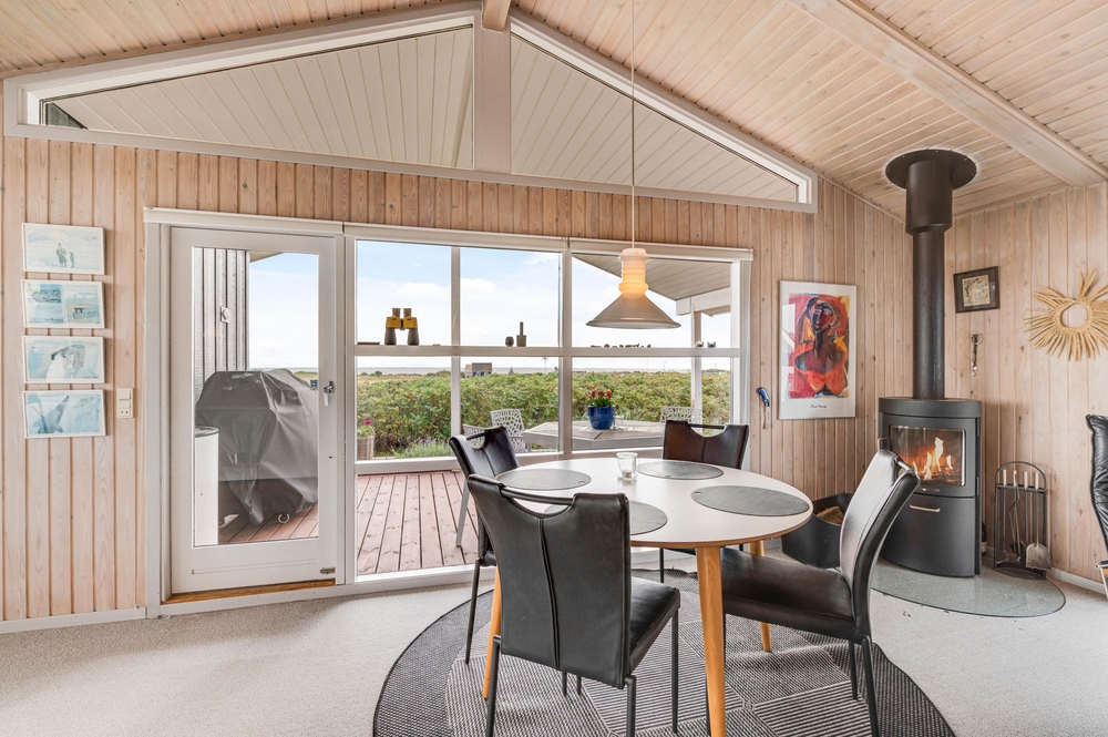 Der großzügige Wohnbereich mit integrierter Küche und sogar 2 Essplätzen wurde mit einem voll verglasten Giebel versehen, welches euch einen fantastischen Panoramablick direkt auf den Ringkøbing Fjord bietet! Hier habt ihr die Möglichkeit, fantastische Sonnenaufgänge zu erleben, welche wirklich spektakulär und in wunderschönen Pastelltönen den Tag begrüßen.