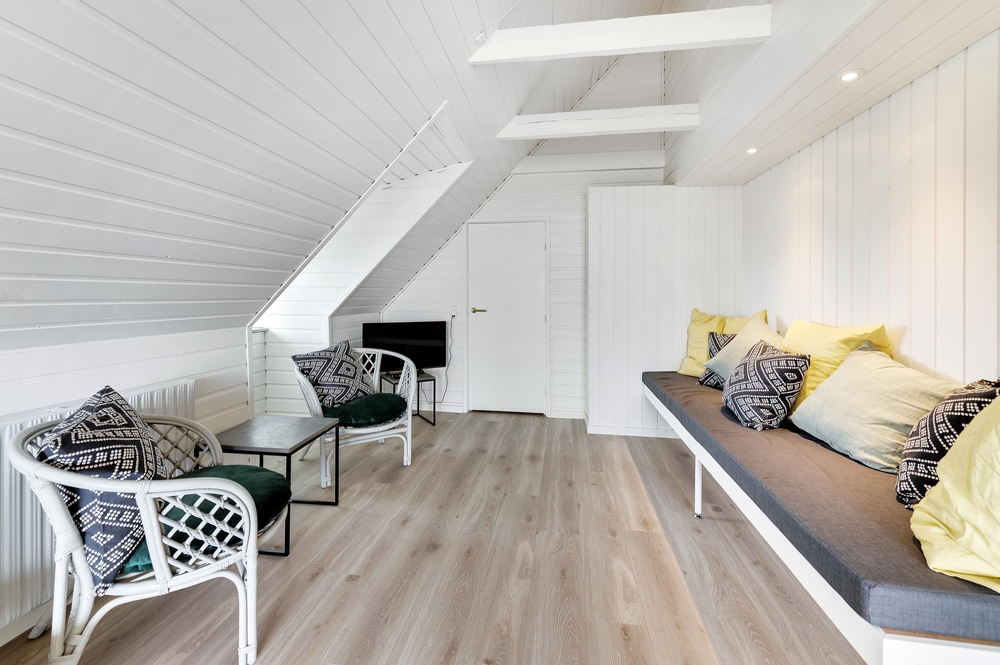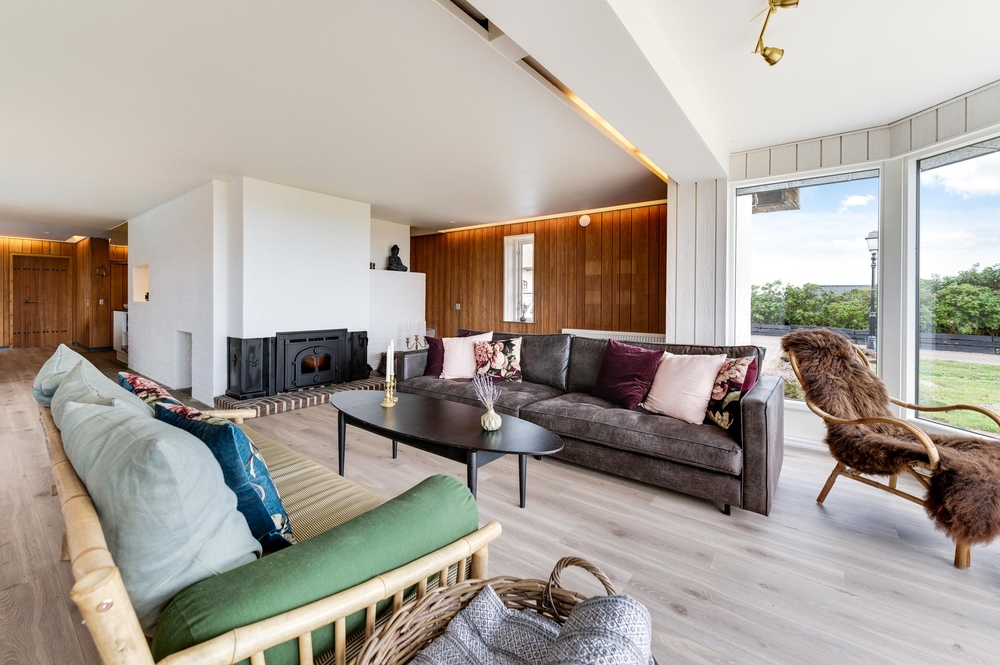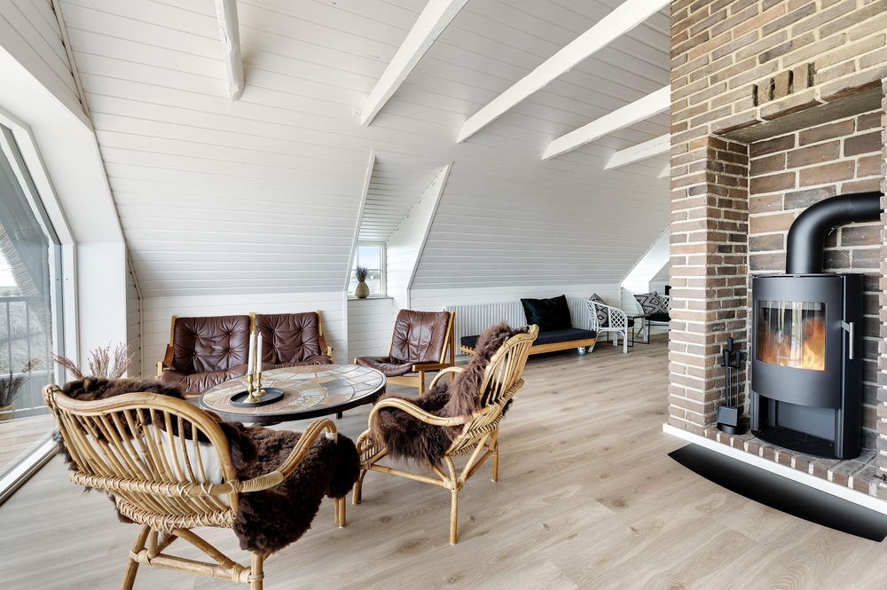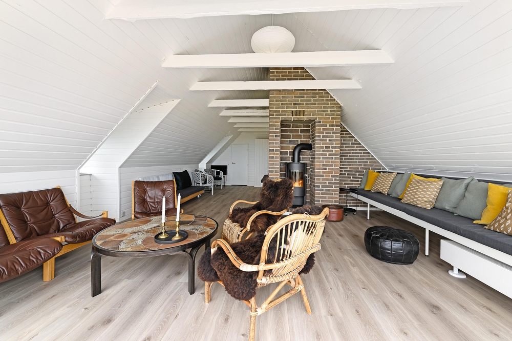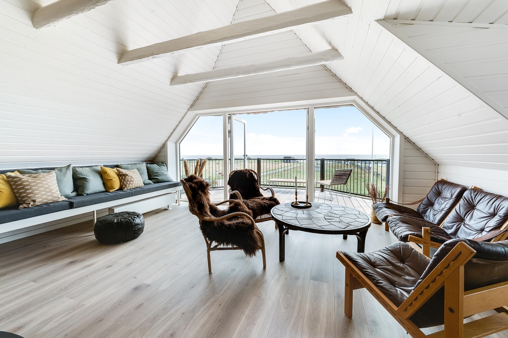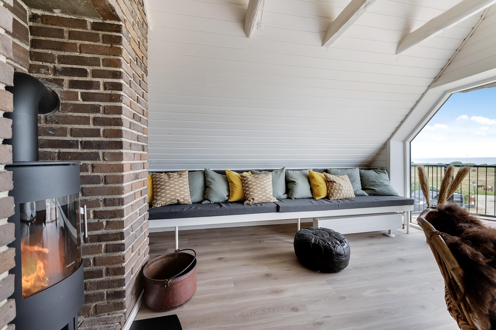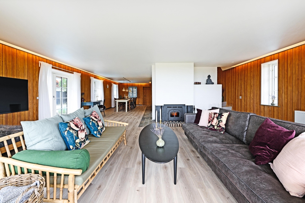 In den Wohnzimmern im Grundgeschoss und Obergeschoss kann man durch die großen Fensterfronten die einzigartige Aussicht zum Fjord genießen oder sich vor dem Kamin versammeln. Der originale Stil des Ferienhauses wurde in der ganzen Einrichtung weitergeführt: Die Kombination aus weißen Wänden, originalen Holzwänden und verschiedenen Holz- und Steinböden schafft eine moderne und gemütliche Stimmung.