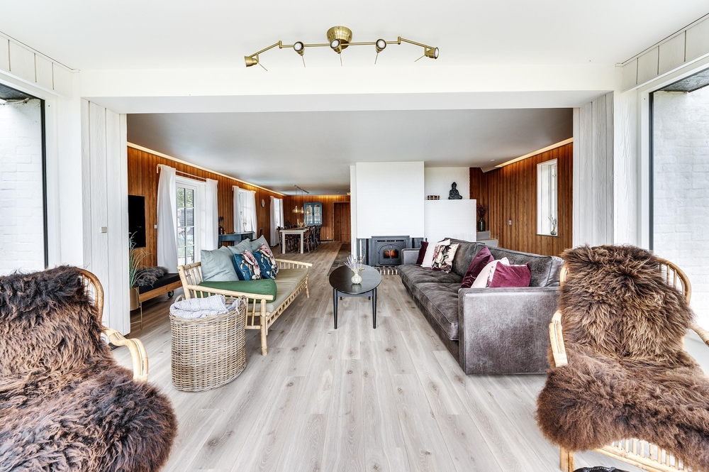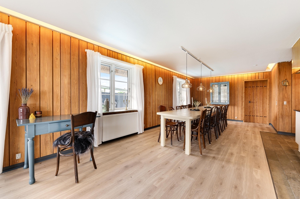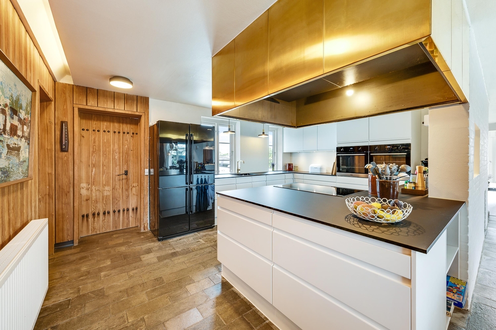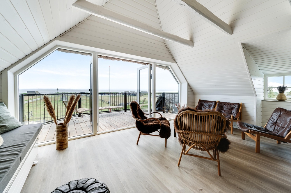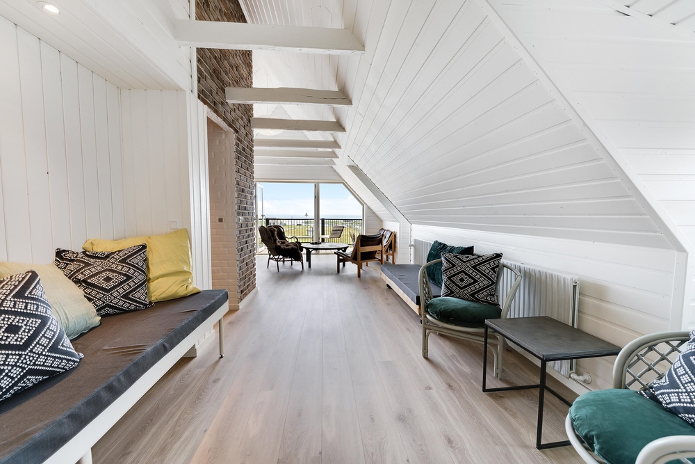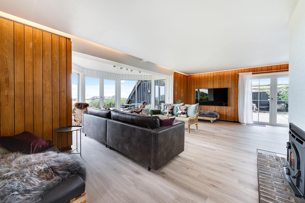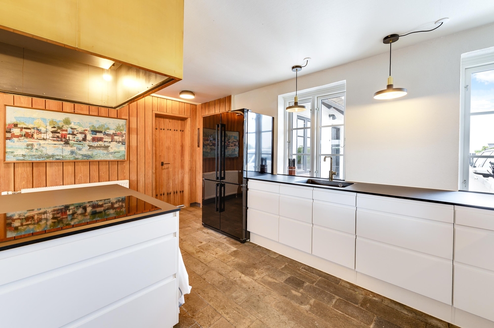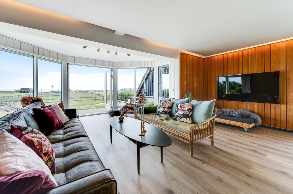 In den Wohnzimmern im Grundgeschoss und Obergeschoss kann man durch die großen Fensterfronten die einzigartige Aussicht zum Fjord genießen oder sich vor dem Kamin versammeln. Der originale Stil des Ferienhauses wurde in der ganzen Einrichtung weitergeführt: Die Kombination aus weißen Wänden, originalen Holzwänden und verschiedenen Holz- und Steinböden schafft eine moderne und gemütliche Stimmung.